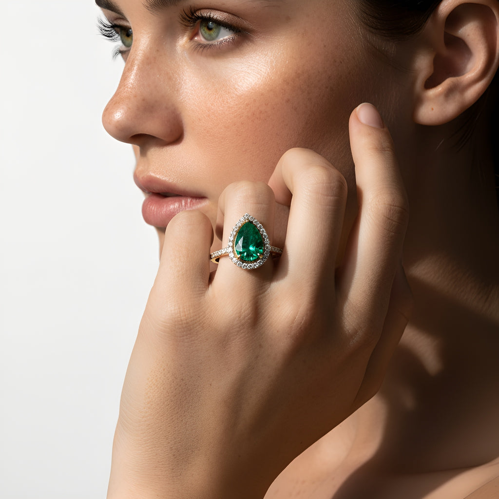 טבעת יוקרה משובצת אבן-חן אמרלד צ'טהאם מוקפת יהלומים טבעיים באיכות מעולה