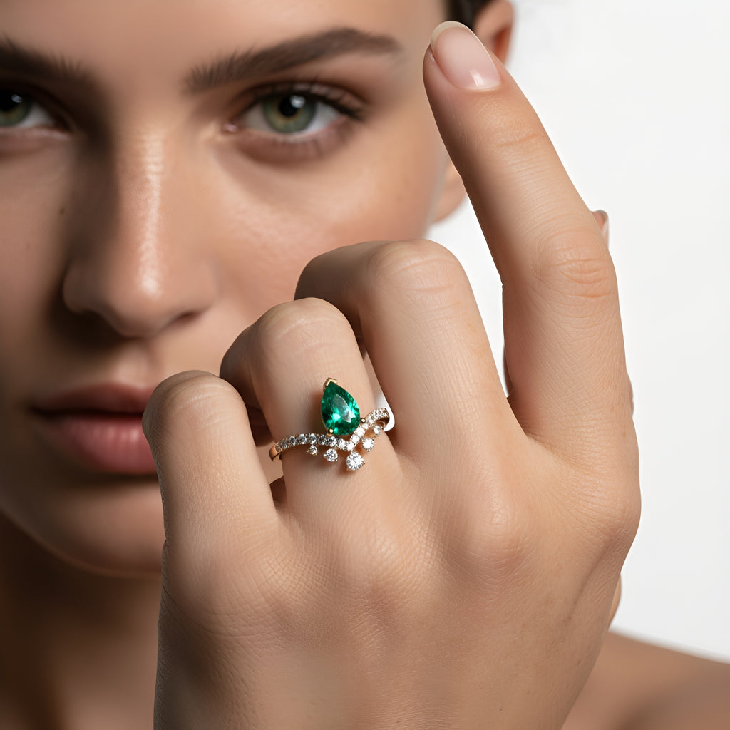 Set with a deep green Chatham emerald gemstone and super-cut diamonds.
