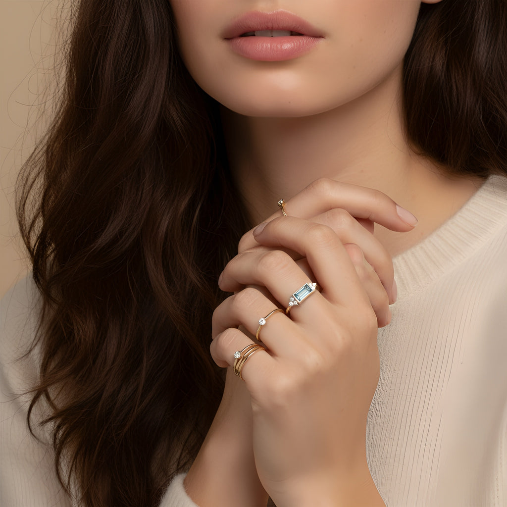 A gold ring set with a blue aquamarine baguette gemstone and diamonds in a vintage inspired design with a modern twist.