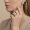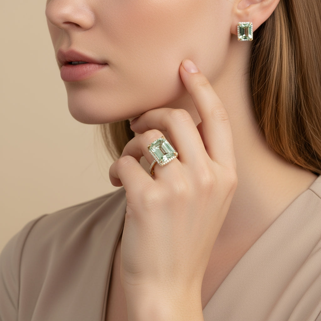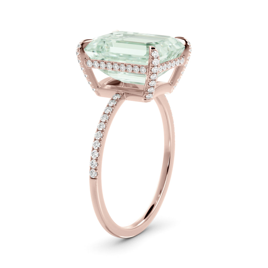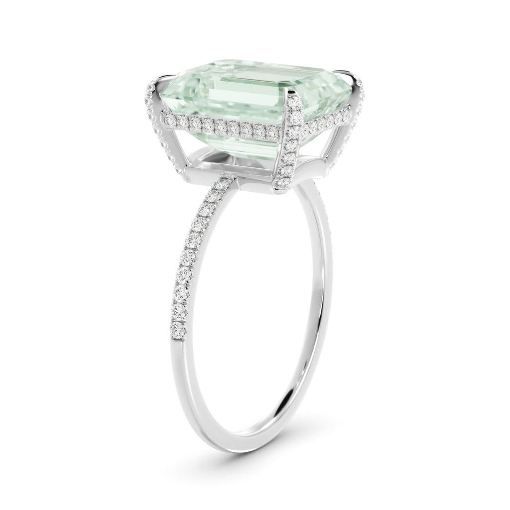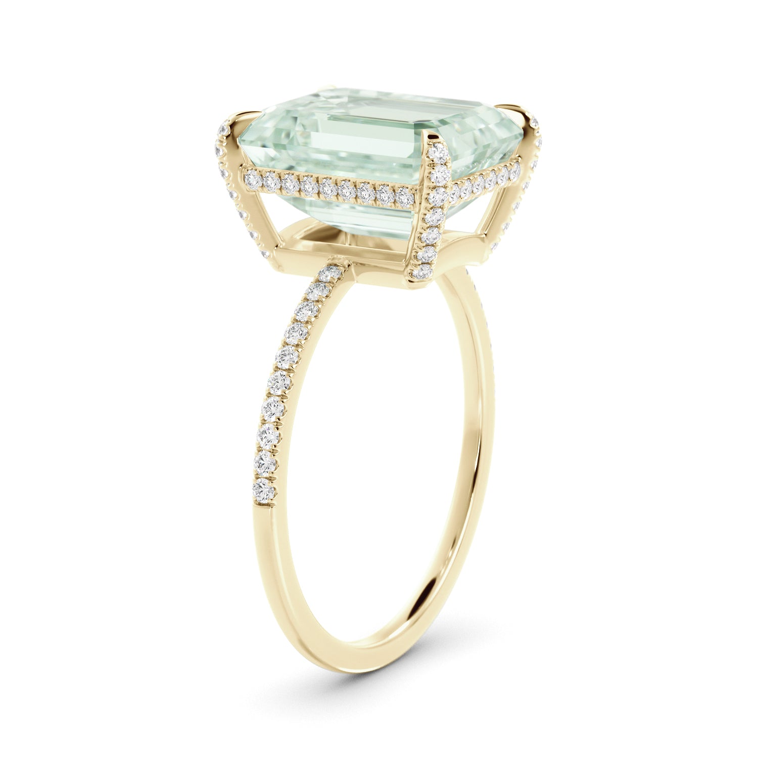 טבעת זהב בעיצוב מודרני ומרשים, המשובצת באבן אקוומארין ירקרקה בחיתוך אמרלד בגודל 12x10 מ״מ (משקל 6.95 קראט) – אבן נדירה המשדרת שלווה, רוך ואצילות טבעית.