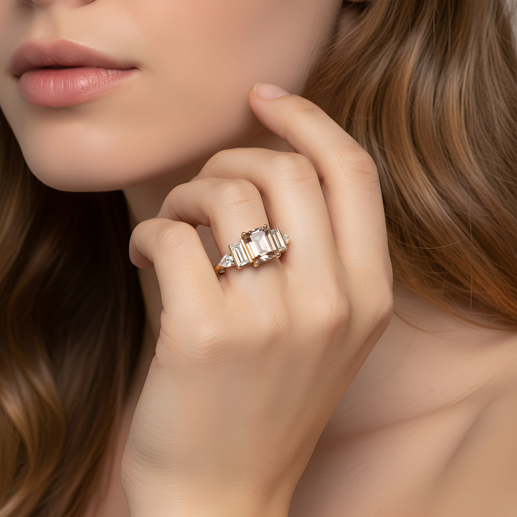 גלי זוהר מלכותי עם טבעת הזהב המרהיבה הזו בעבודת יד. מורגנייט עוצרת נשימה בחיתוך אמרלד, מוקף ביהלומי באגט ויהלומים בחיתוך טיפה. עיצוב מודרני-קלאסי המשדר יוקרה וייחודיות. מושלמת כטבעת אירוסין, מתנת יום נישואין או מתנה בלתי נשכחת.