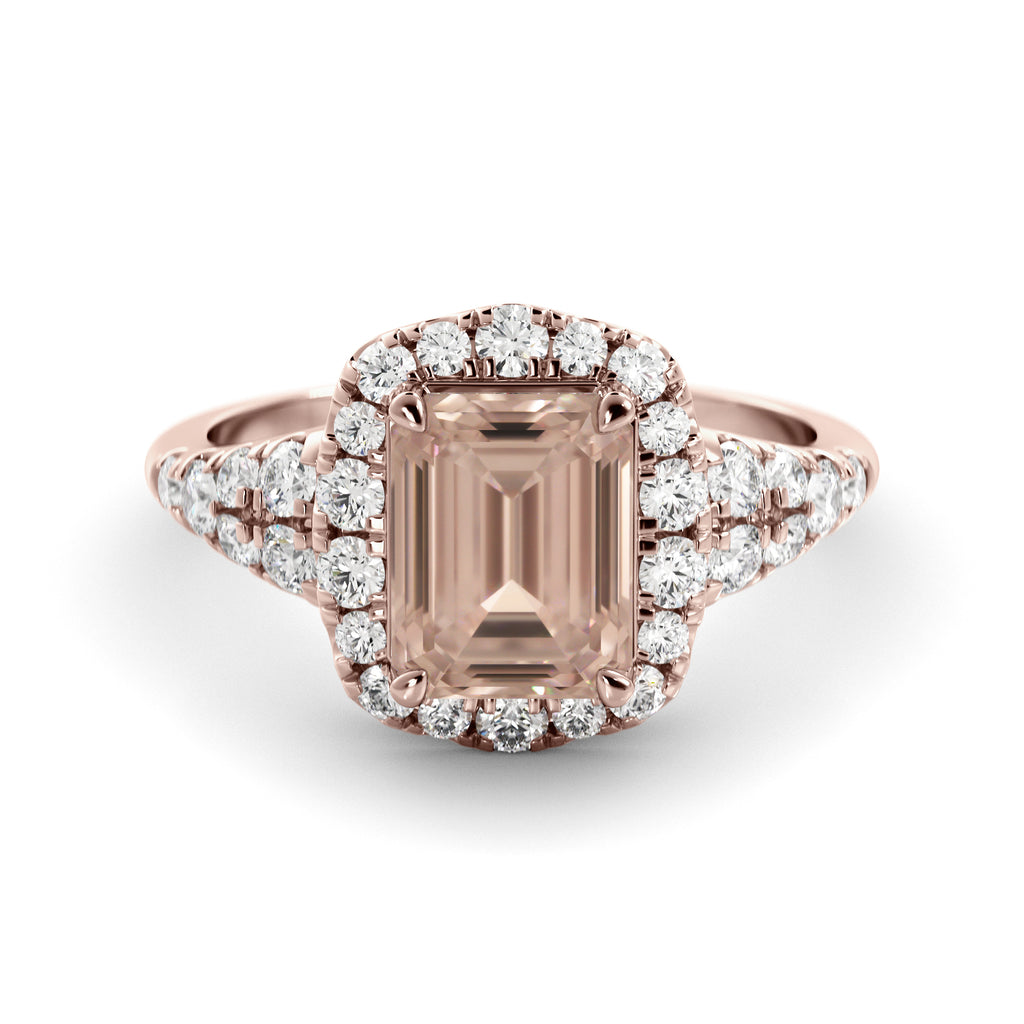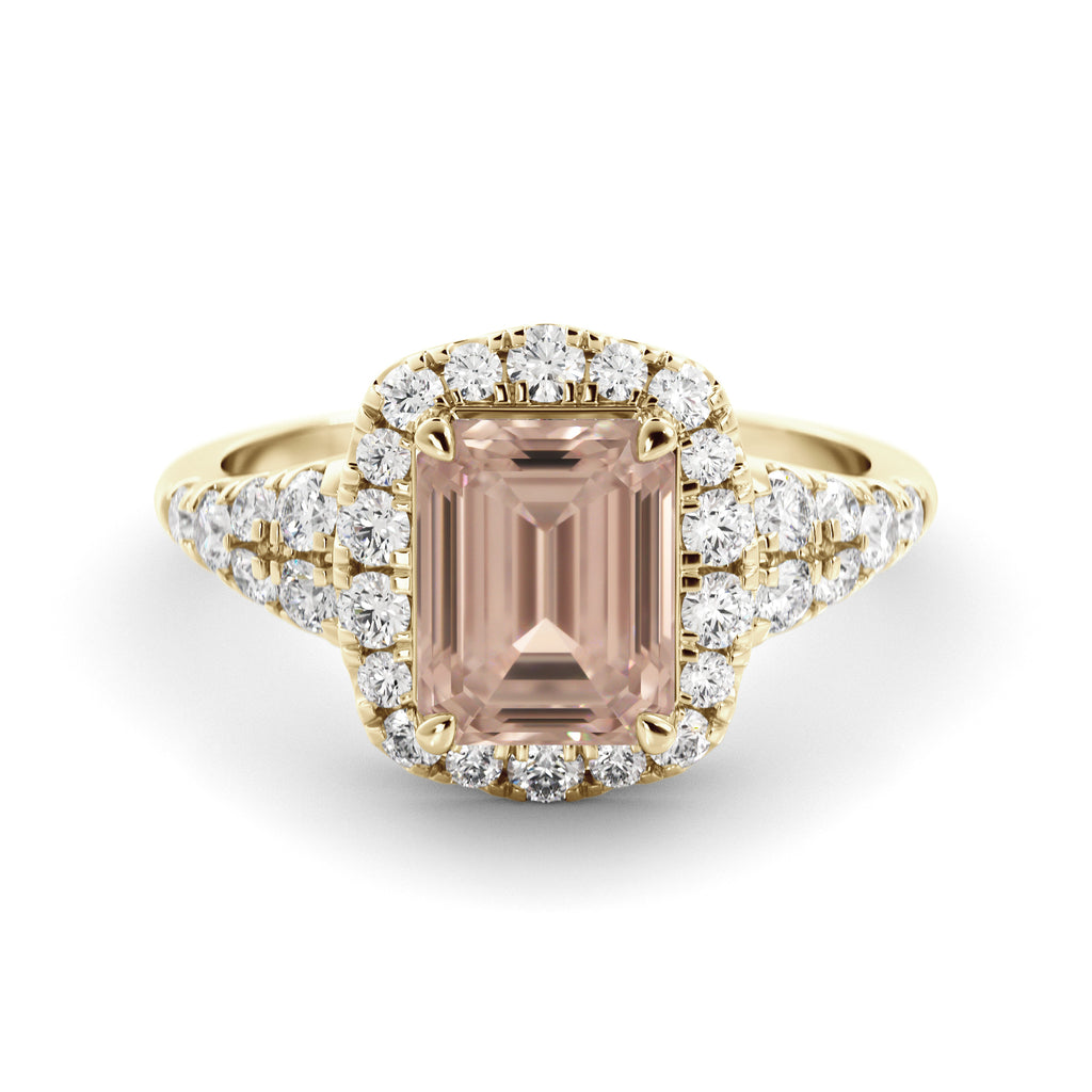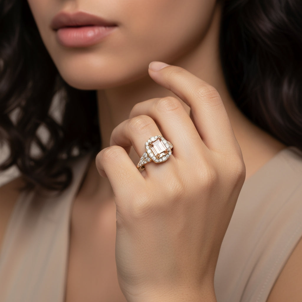 טבעת זהב מרהיבה בעיצוב הילה כפולה, עם אבן חן מורגנייט בחיתוך אמרלד (9x7 מ״מ, 2.75 קראט, דרגת איכות AAA) במרכז. האבן הקסומה משדרת שלווה, ניקיון ואצילות – ומוקפת ב-30 יהלומים לבנים נוצצים (0.95 קראט, VS-D) היוצרים הילה בוהקת סביב הצבע הרך והרגוע של המורגנייט.