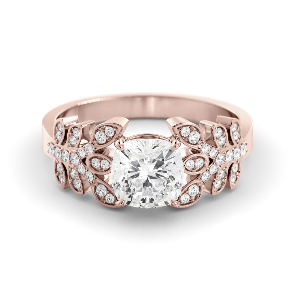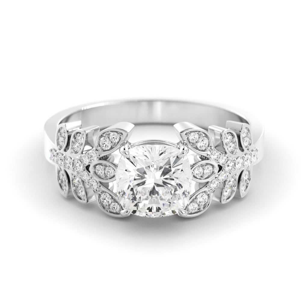 במרכז ניצב יהלום בחיתוך קושן (Cushion Cut) בגודל 7x7 מ"מ – משקל מוערך כ־1.78 קראט, ולצידו 44 יהלומים קטנים המפוזרים על זרועות בעיצוב עלים עדין וזוהר.