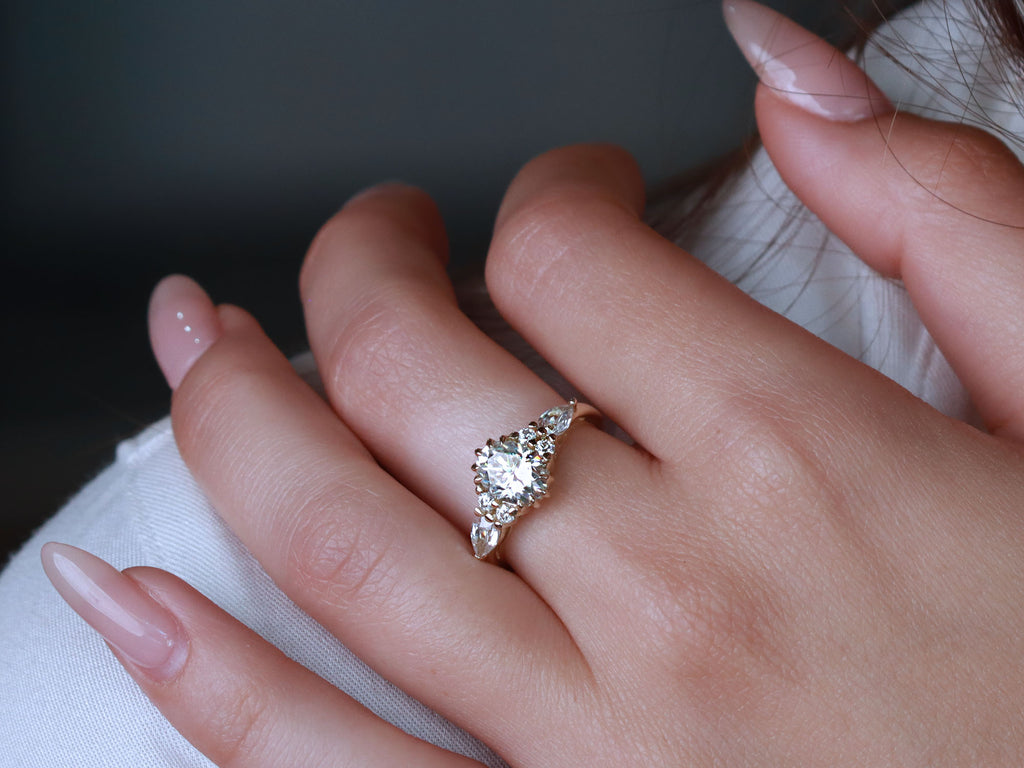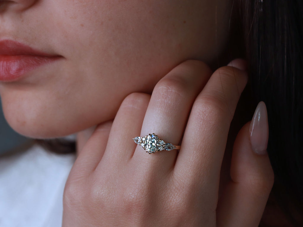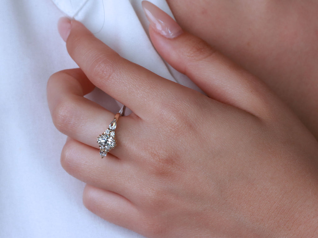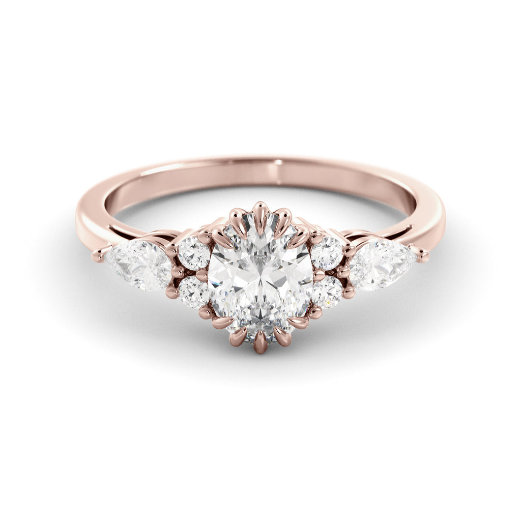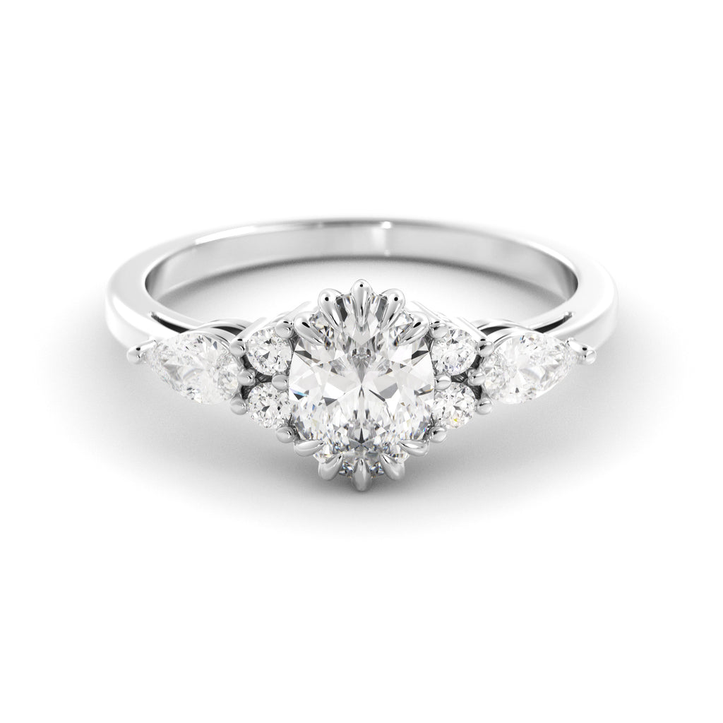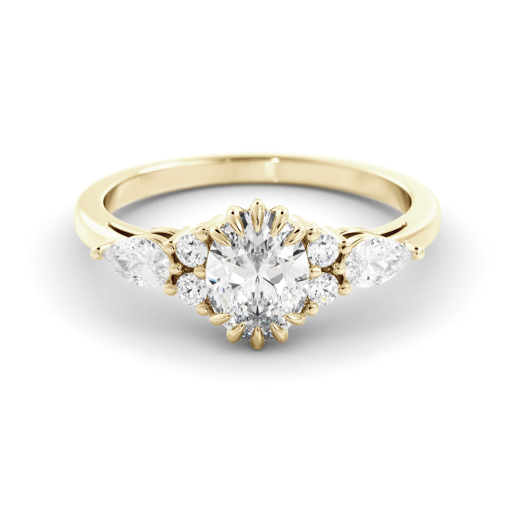 הטבעת הזו עשויה זהב יוקרתי ומשובצת כולה ביהלומי מעבדה נוצצים – עם אבן מרכזית Oval מרשימה ולצידה יהלומים בחיתוך טיפה ועגול שמוסיפים לה נצנוץ מלכותי. זהו עיצוב על-זמני שמשלב קלאסיקה נצחית עם בחירה מודרנית חכמה – כי יהלומי מעבדה מציעים את אותו יופי וברק כמו יהלום טבעי, אבל עם ערך טוב יותר ובחירה מודעת.