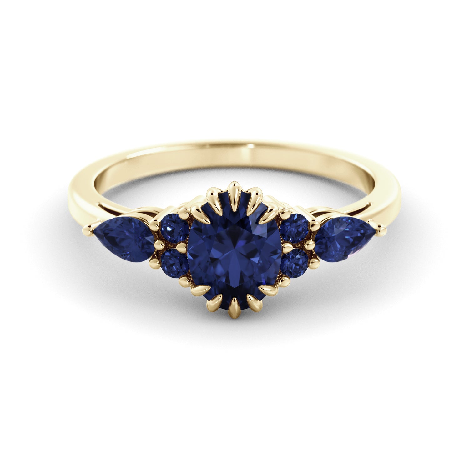 טבעת זהב ייחודית ואלגנטית בעיצוב קלאסי עם טוויסט מודרני. במרכזה משובצת אבן ספיר כחולה אובלית, מוקפת בשתי אבני ספיר בצורת טיפה וארבע אבנים עגולות נוספות. שילוב זה יוצר מראה מלכותי, הרמוני ומלא ברק. הכחול העמוק של הספירים מול הזהב הצהוב מבליט את עוצמת האבן המרכזית ומעניק לטבעת מראה נשי, נצחי ומלא עוצמה.