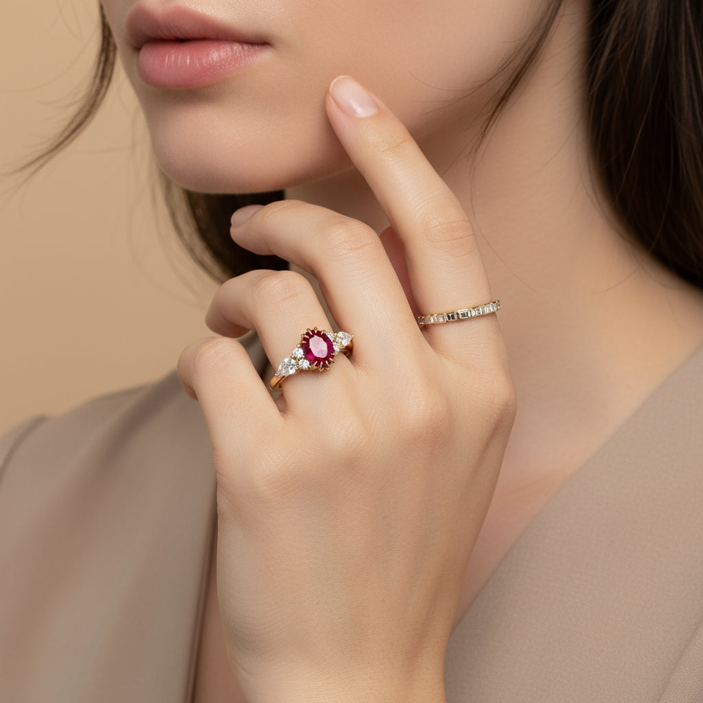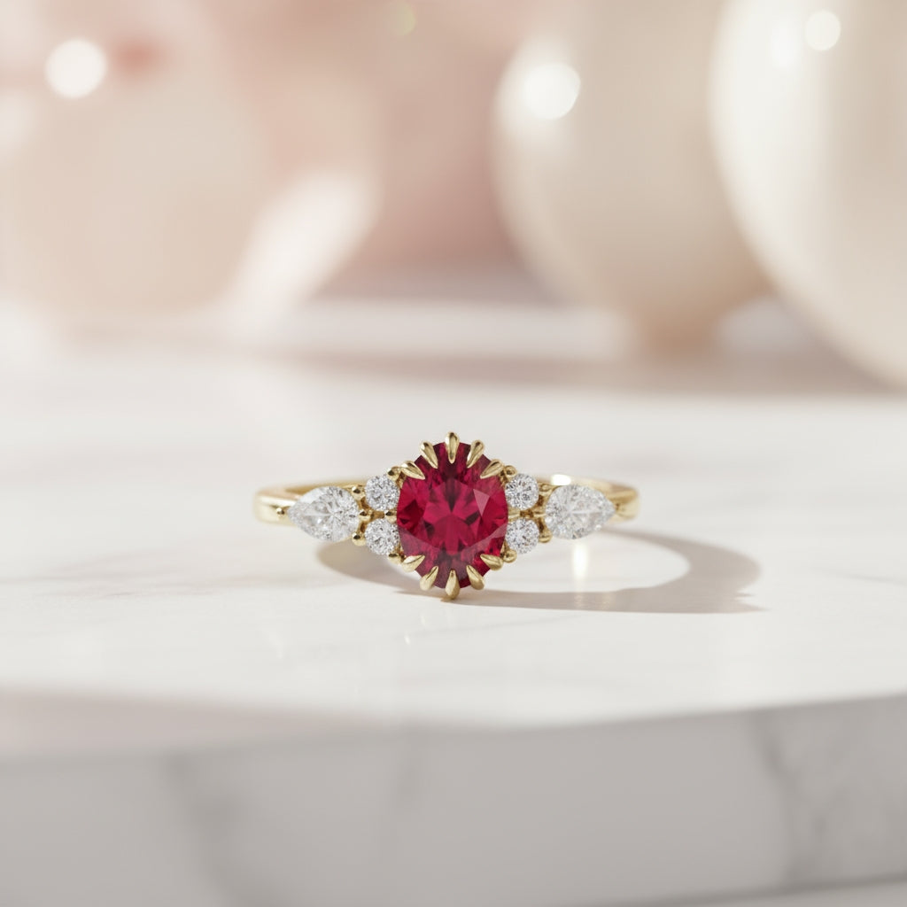 טבעת זהב מלכותית עם אבן רובי Oval במרכז, בעלת צבע אדום עז ונועז. משני צדדיה משתלבים יהלומים בצורת טיפה יחד עם יהלומים עגולים קטנים, היוצרים עיצוב סימטרי, יוקרתי ומרהיב. השילוב בין הזהב החמים, האדום העמוק של הרובי והברק הטהור של המוסונייטים הופך את הטבעת לתכשיט עוצמתי, מלא תשוקה ואצילות – טבעת שלא ניתן להתעלם ממנה.
