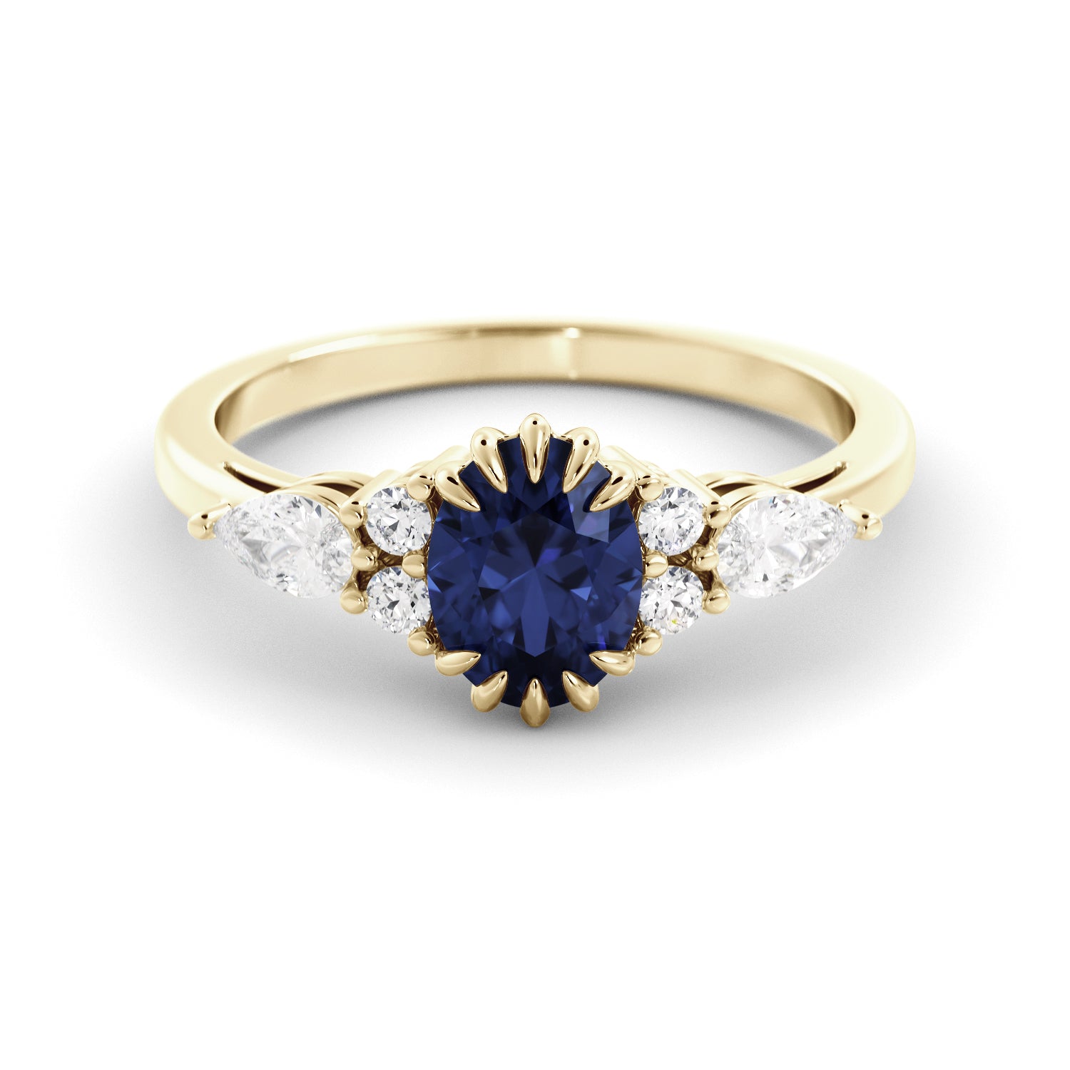 טבעת זהב ייחודית ואלגנטית בעיצוב קלאסי עם טוויסט מודרני. במרכזה משובצת אבן ספיר כחולה אובלית, מוקפת באבני-חן מוסונייט מבריקות במיוחד בצורת טיפה וארבע אבנים עגולות נוספות. שילוב זה יוצר מראה מלכותי, הרמוני ומלא ברק. הכחול העמוק של הספירים מול הזהב הצהוב מבליט את עוצמת האבן המרכזית ומעניק לטבעת מראה נשי, נצחי ומלא עוצמה.