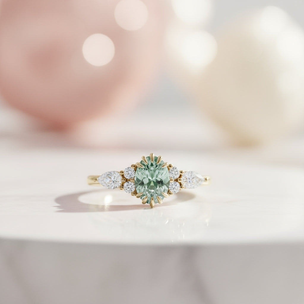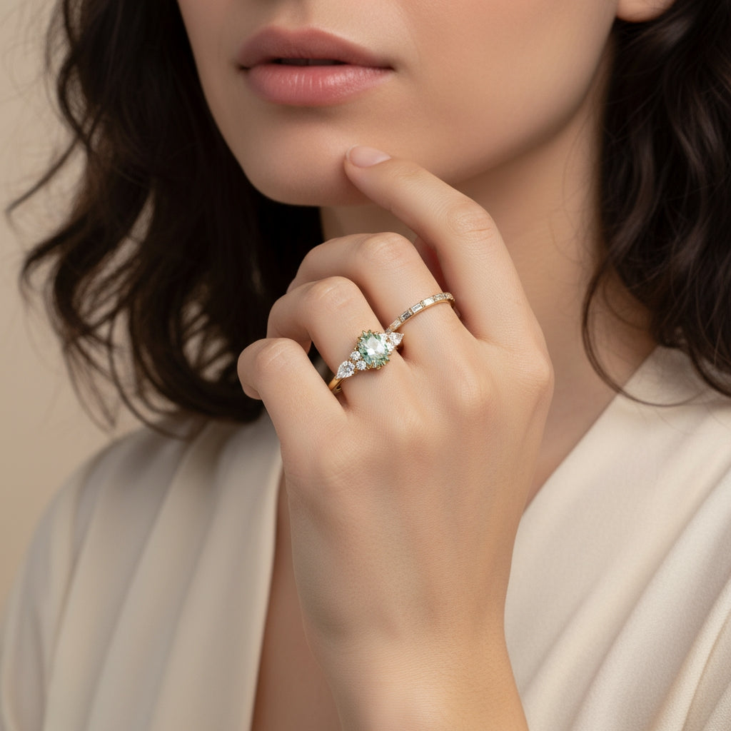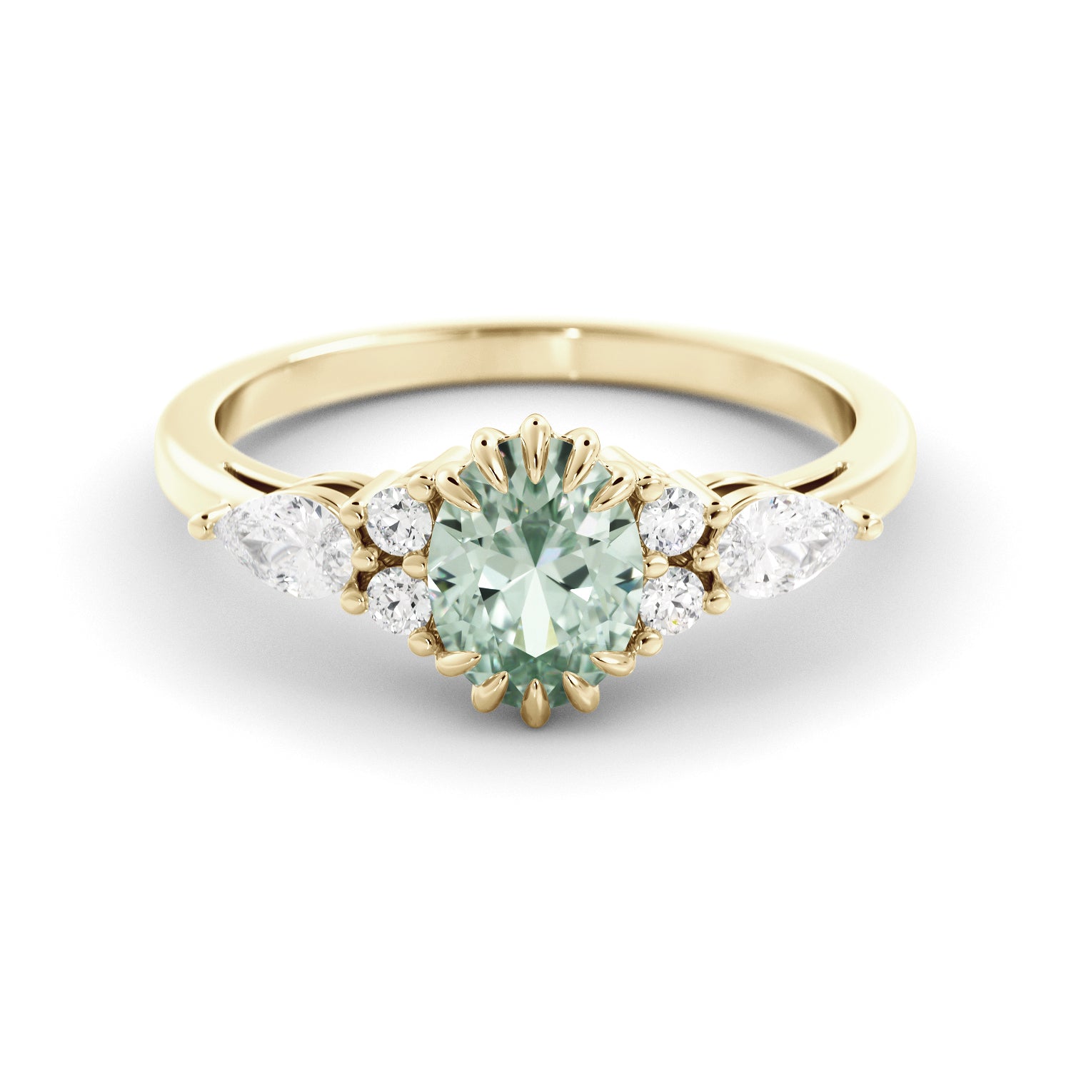 טבעת זהב ייחודית עם אבן אקוומארין ירקרקת בחיתוך אובלי במרכז, אבן בעלת גוון עדין ורך המשדר רוגע ותחכום עדין. משני צדדיה משולבות אבני מוסונייט נוצצות בצורת טיפה יחד עם אבנים עגולות קטנות יותר, ליצירת איזון מושלם בין ברק וטוהר עדין. השילוב בין הזהב החמים, הירוק הרך והנצנוץ הלבן מעניק לטבעת מראה נשי, מודרני ועל-זמני – בחירה מושלמת לאירוסין ייחודיים או כמתנה מלאת משמעות.