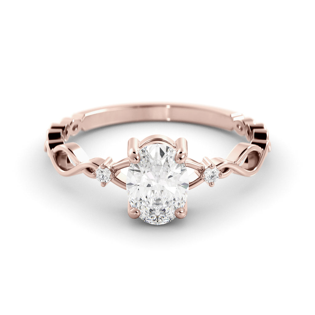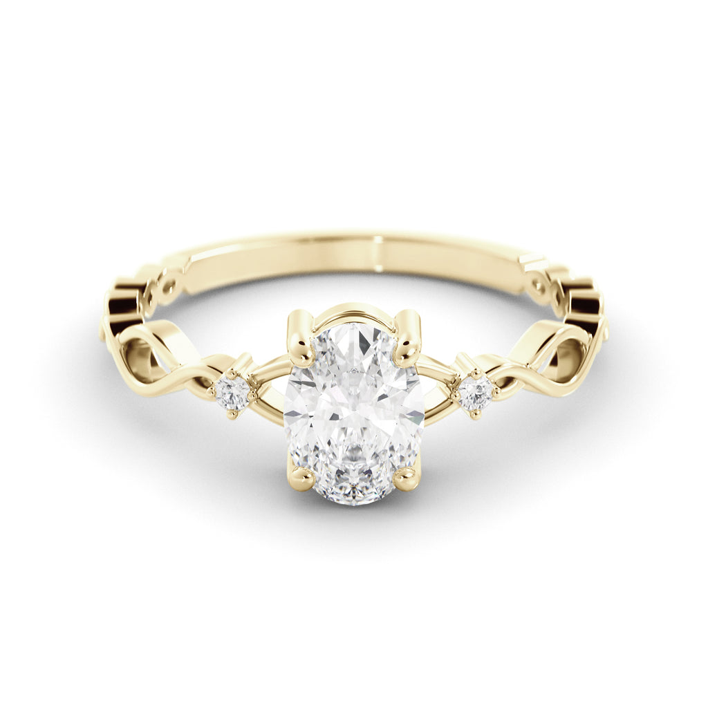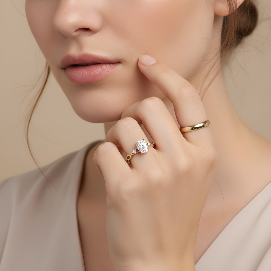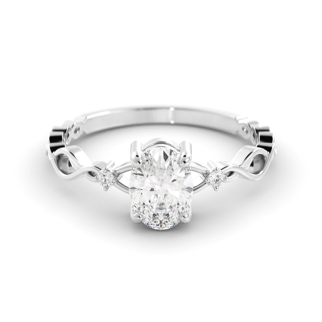 במרכז ניצב יהלום מעבדה מרהיב בחיתוך אובלי, המשובץ ביד אומן במסגרת עדינה.