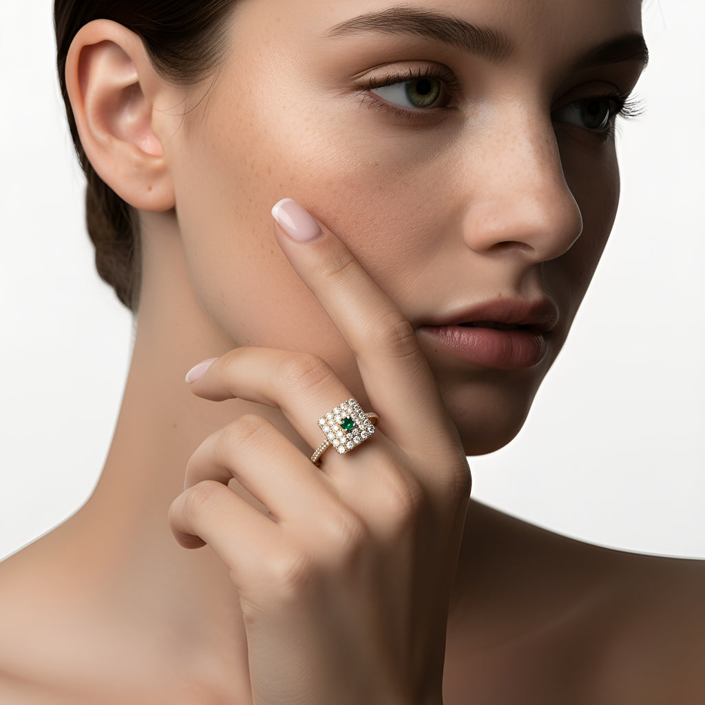 טבעת יוקרה משובצת אבן-חן אמרלד ירוקה מוקפת יהלומים טבעיים באיכות מעולה.