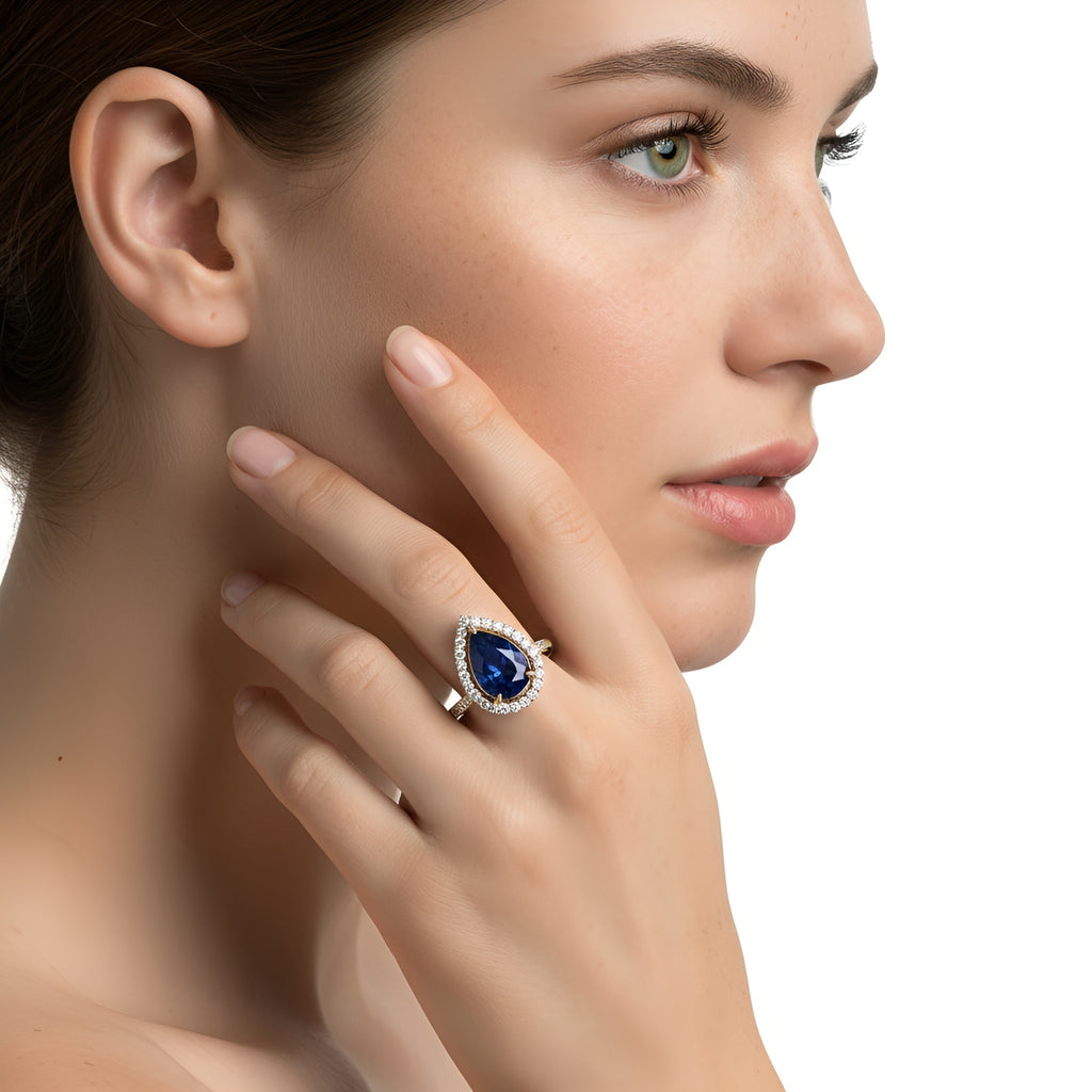 טבעת יוקרה משובצת אבן-חן ספיר קורנדום מוקפת יהלומים טבעיים באיכות מעולה