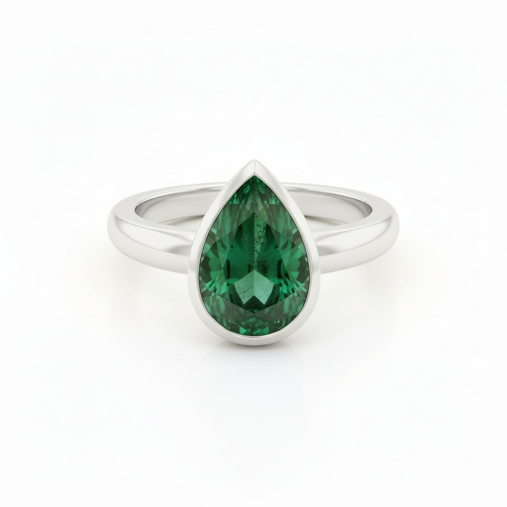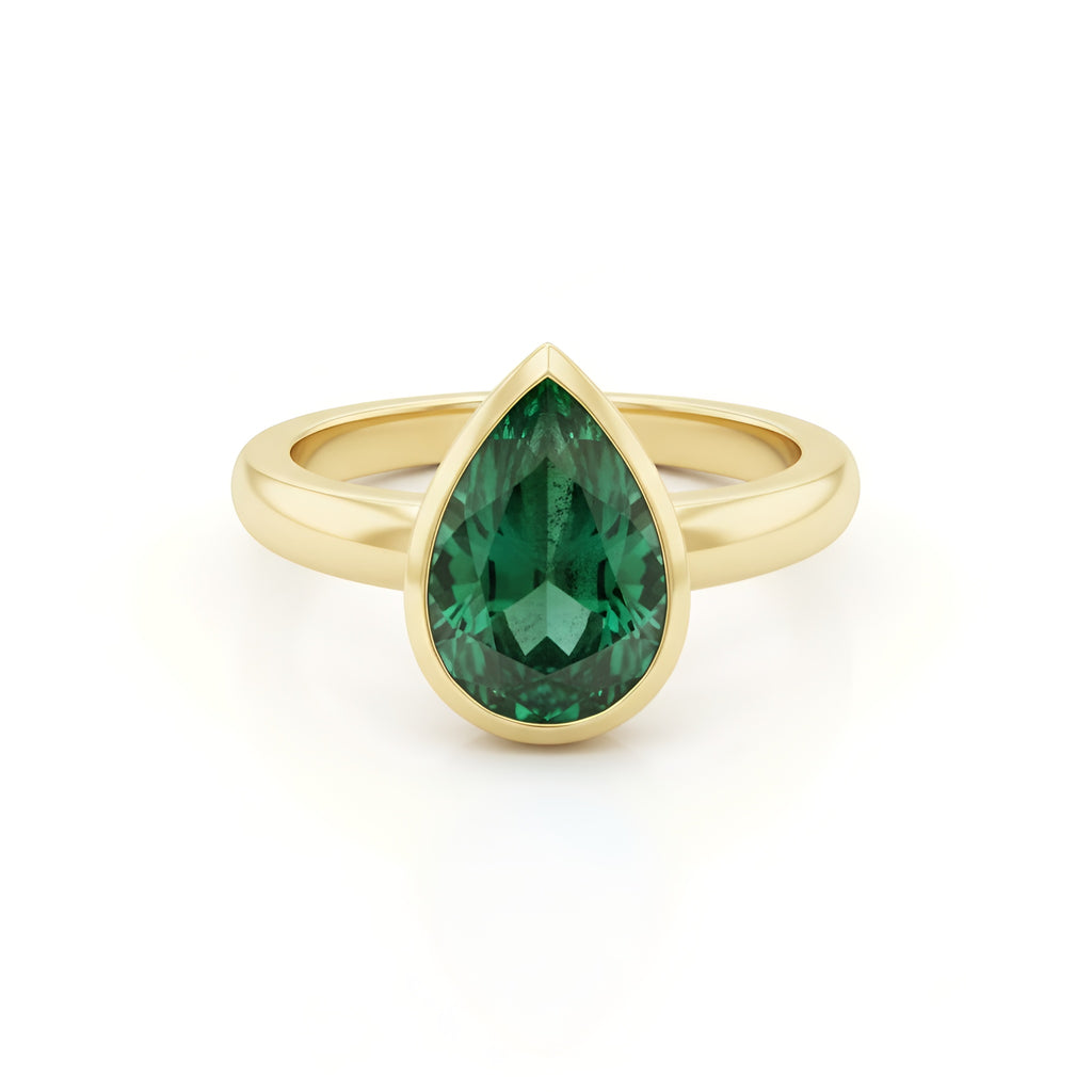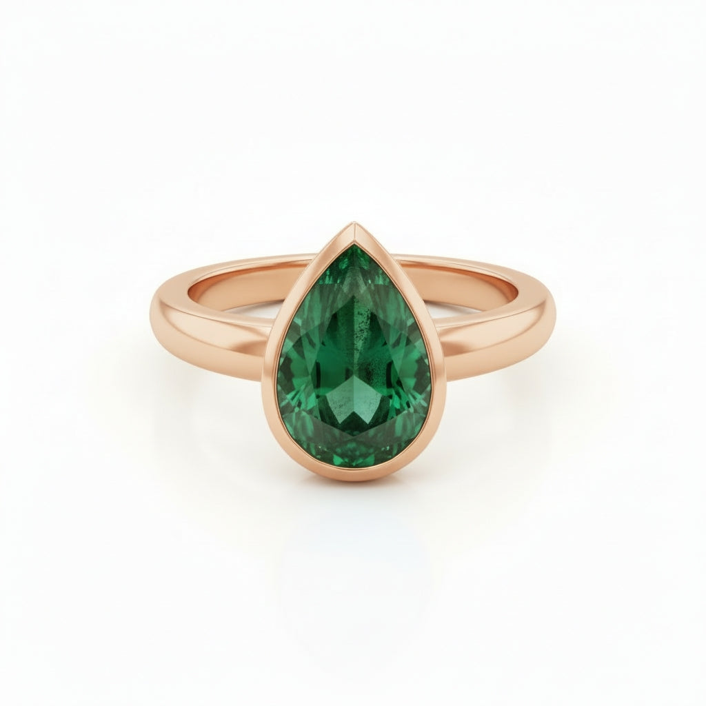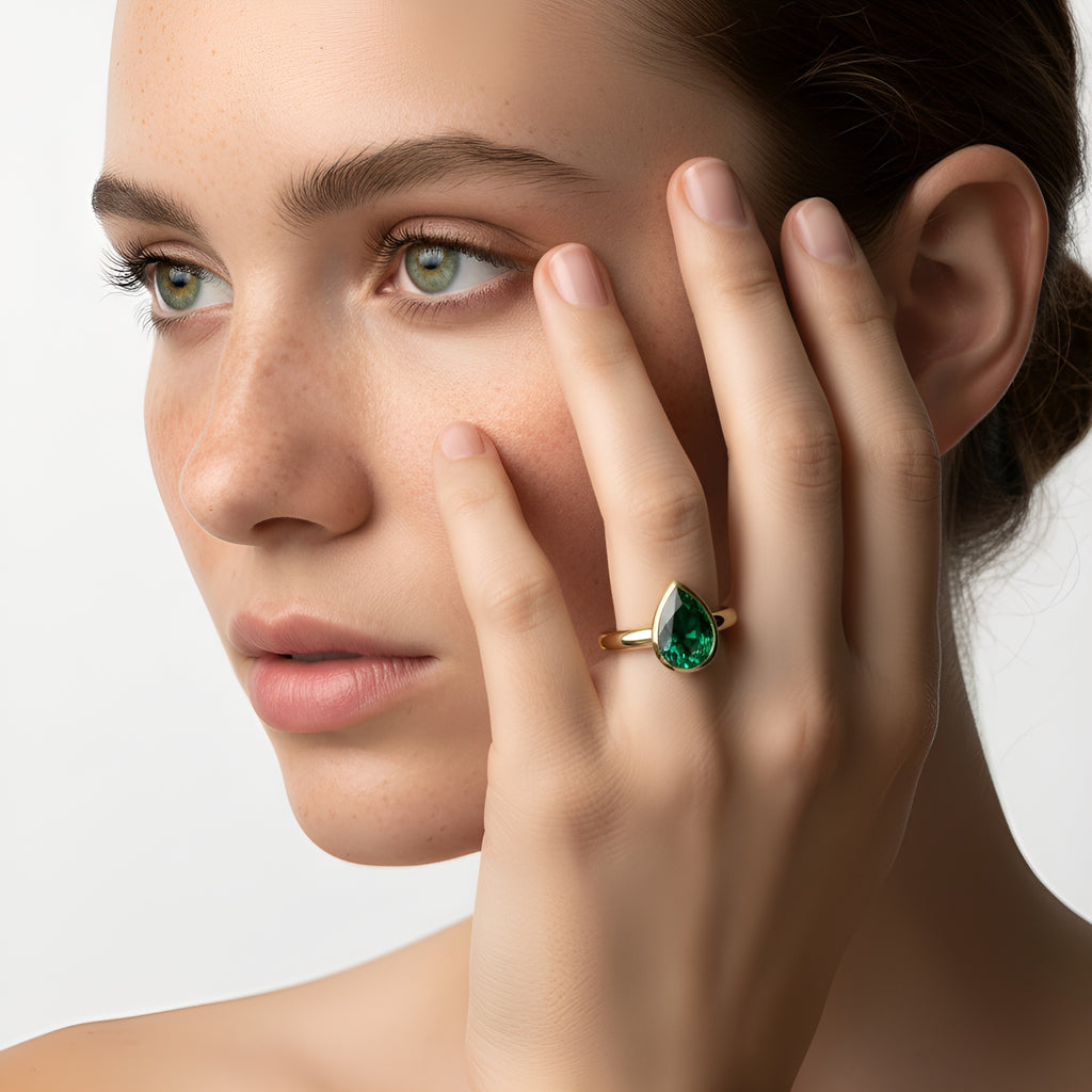 טבעת זהב אלגנטית עם אבן אמרלד טבעית בחיתוך טיפה, במידות 8×6 מ״מ. האבן משובצת במסגרת זהב חלקה ונקייה, המדגישה את הגוון הירוק העמוק והעשיר של האמרלד ומעניקה לו נוכחות מרשימה ועדינה כאחד.