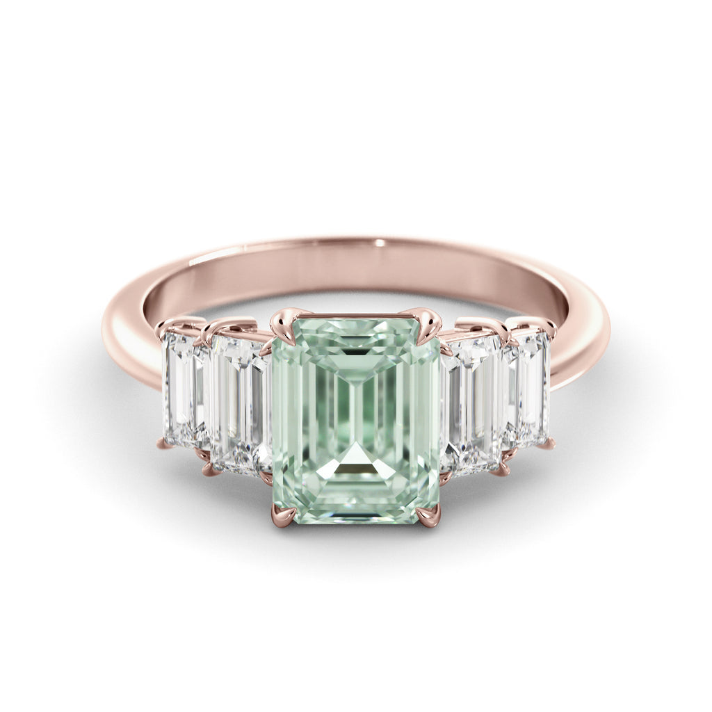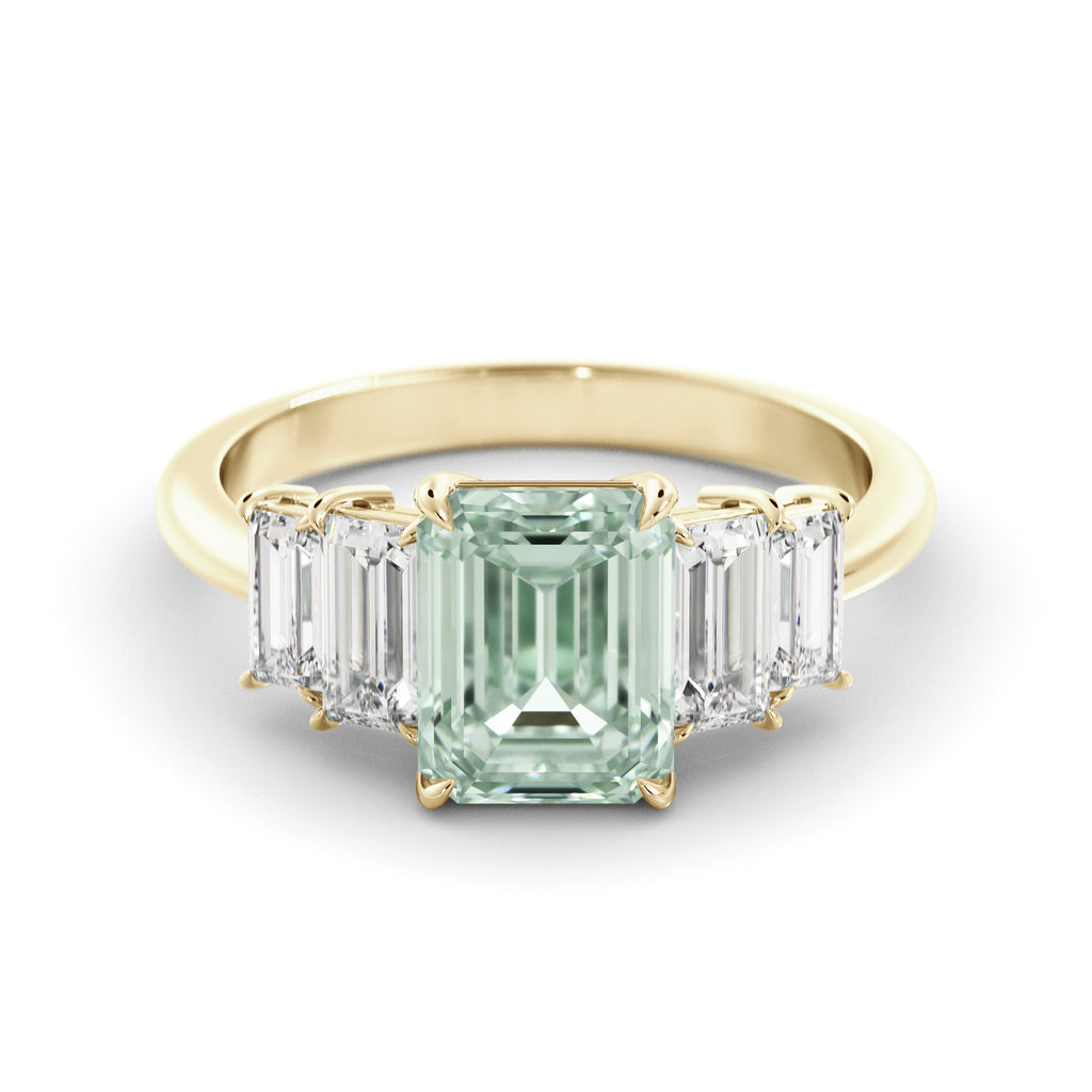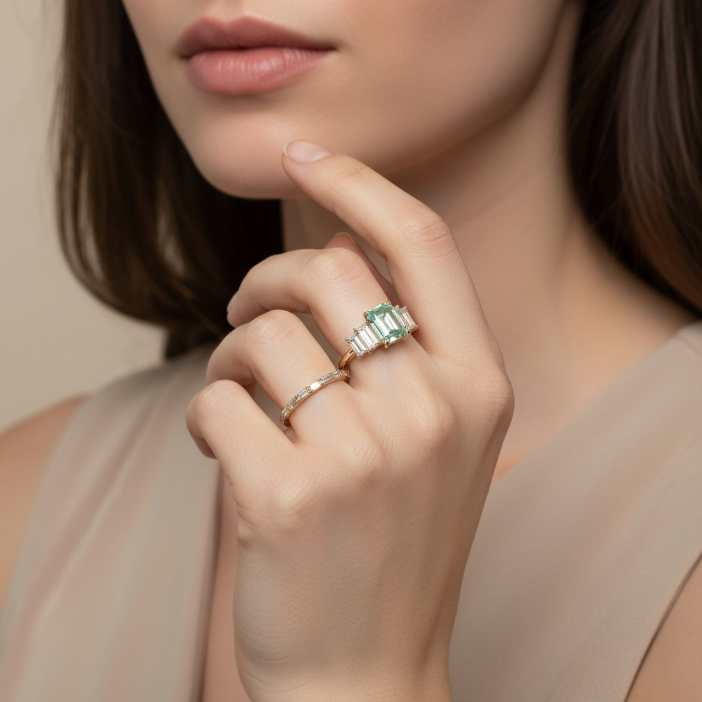 במרכז ניצבת אבן אקוומארין ירוקה בחיתוך אמרלד (Emerald Cut), בגודל 9x7 מ״מ – אבן ייחודית המשדרת שלווה, איזון ואצילות טבעית.