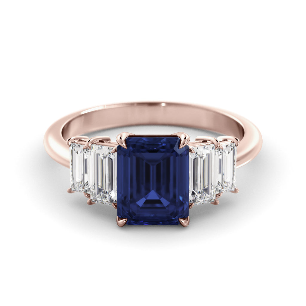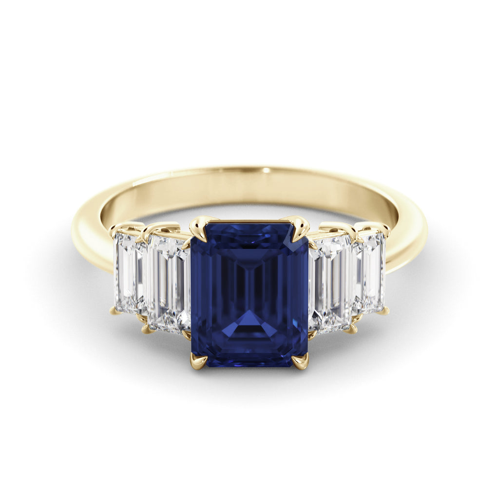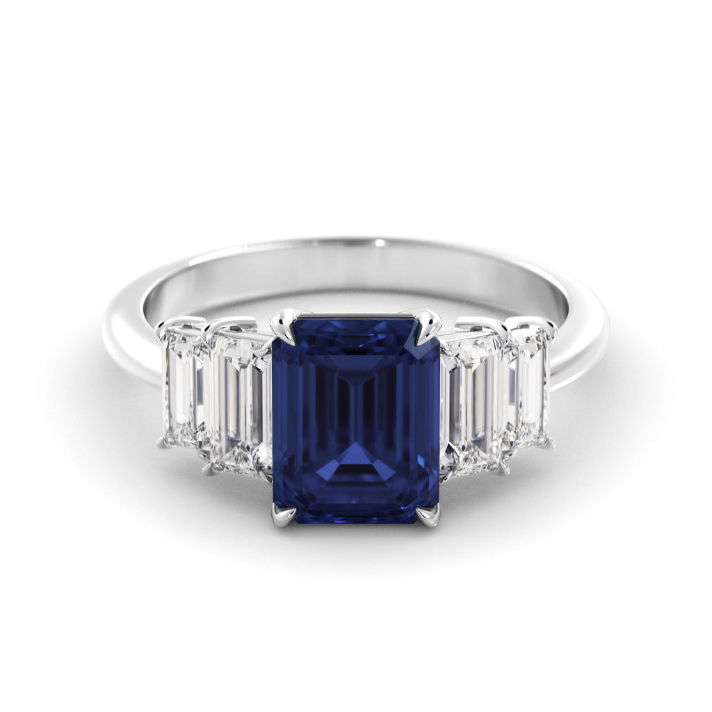 משני צידיה משובצים ארבעה יהלומי מעבדה (Lab Grown Diamonds) מלוטשים בחיתוך baguette, המדגישים את עומק הצבע של הספיר ומוסיפים להילה של יוקרה וניצוץ מושלם.