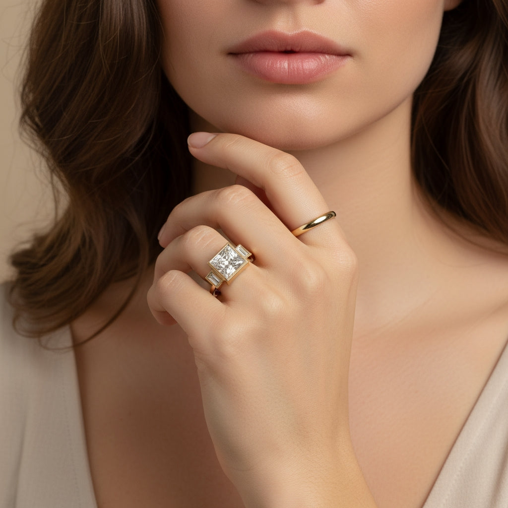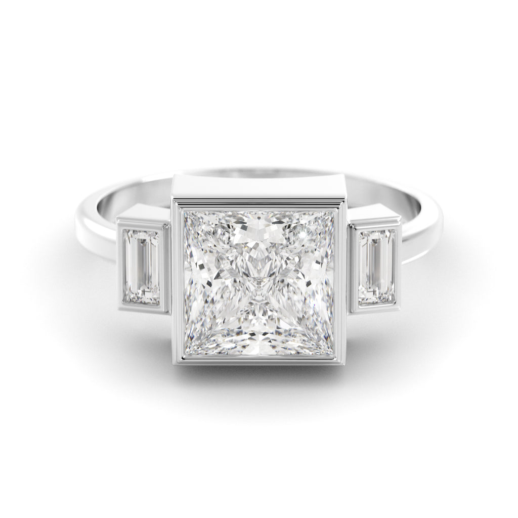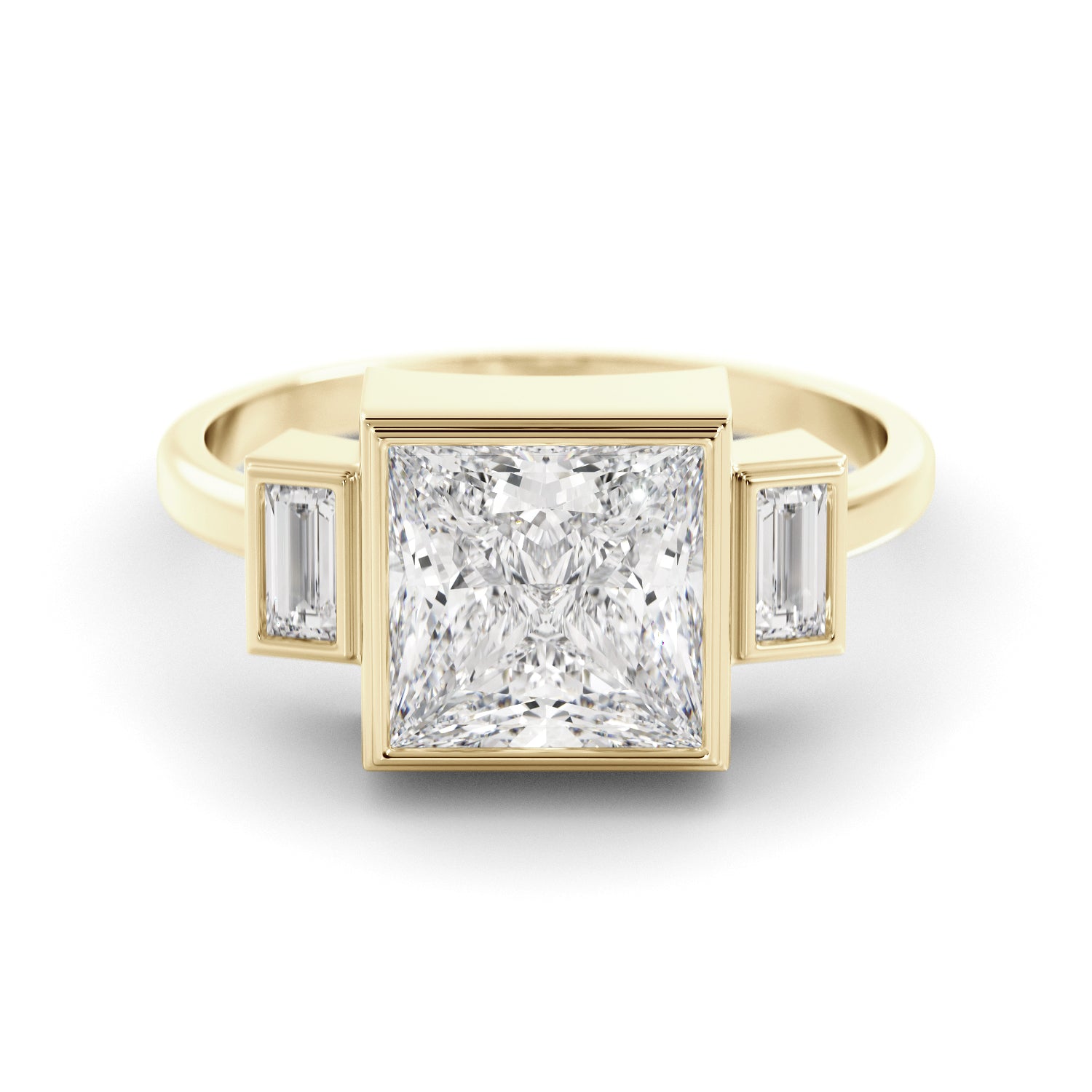 במרכזה נוצץ יהלום מעבדה מרהיב במשקל של כ 3 קראט (בקירוב) בחיתוך פרינסס מרובע מדויק, המשובץ במסגרת זהב עבה ומוקפדת המדגישה את הצורה החזקה והברק יוצא הדופן של האבן.