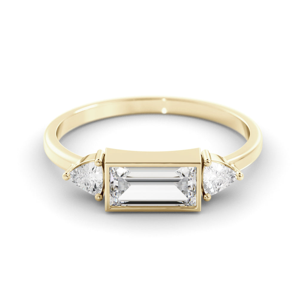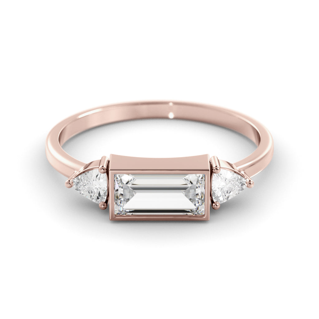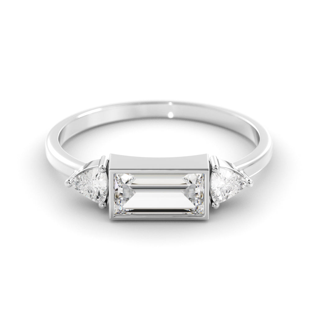 במרכזה יהלום מלבני בחיתוך באגט במשקל כ־0.85 קראט, המשובץ במסגרת זהב מלוטשת ומודגשת בשני יהלומי טריליון נוצצים (סה"כ כ־0.40 קראט).