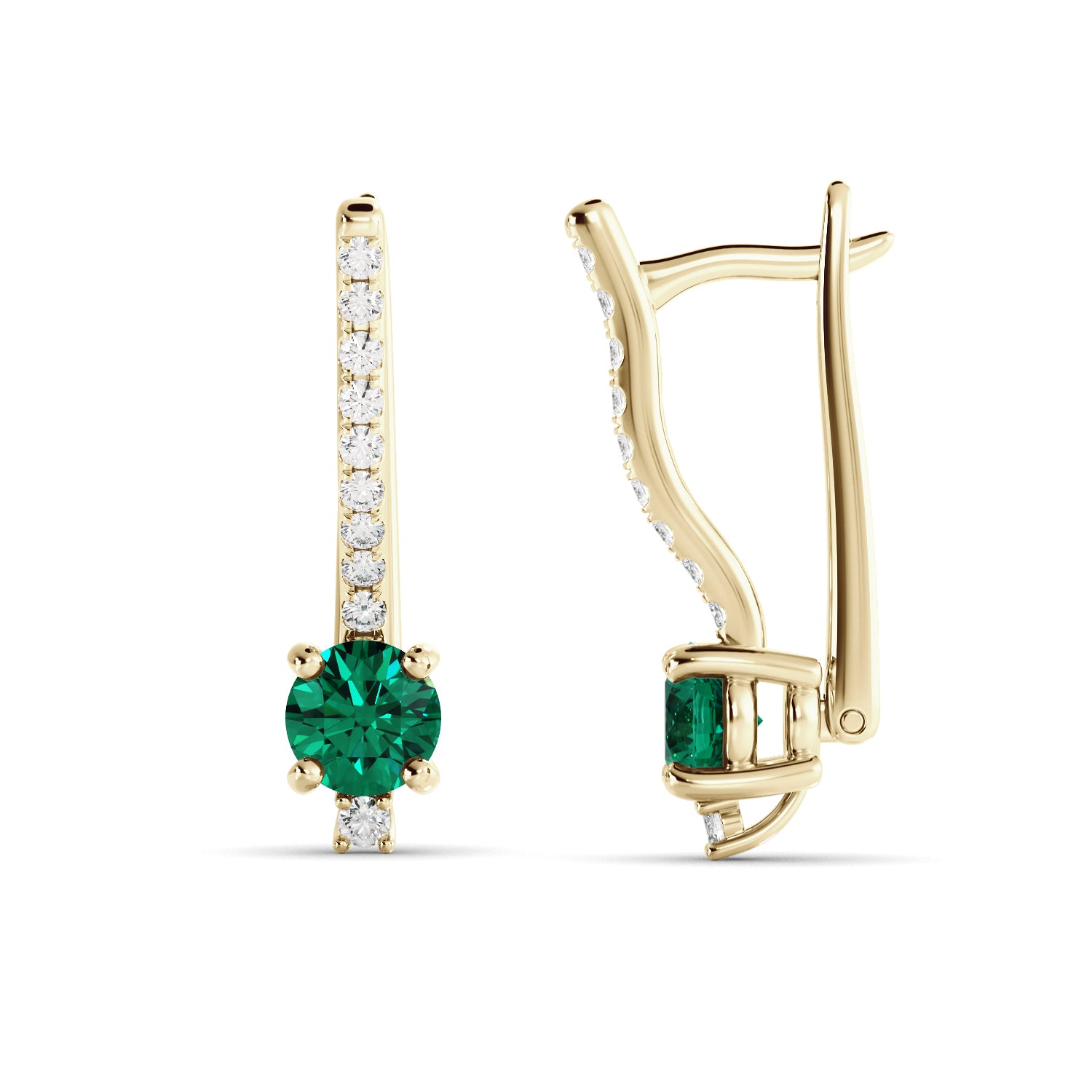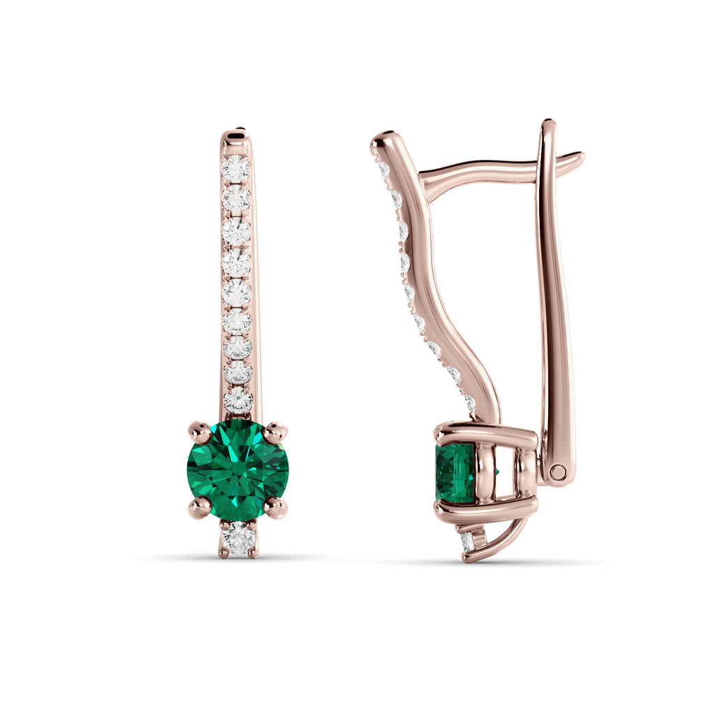 עגילי יוקרה מזהב צהוב עם אמרלד צ'טהאם ירוק ואבני יהלום – שילוב מושלם של אלגנטיות ונוכחות. העגילים עשויים זהב 14K בעיצוב קלאסי ומעודן, משובצים אבן אמרלד עגולה במרכז בעלת גוון ירוק עמוק ומרהיב. מסביב לאבן המרכזית ובחלק הקדמי של העגיל משובצים יהלומים קטנים ונוצצים, המוסיפים ברק ייחודי ויוקרה בלתי מתפשרת.