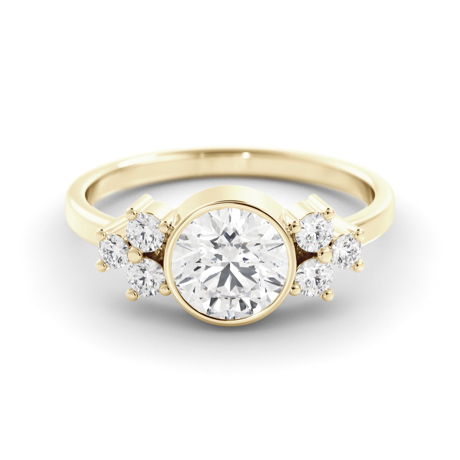 במרכזה יהלום עגול בחיתוך מושלם, משובץ במסגרת זהב חלקה המדגישה את הברק הטבעי והעומק של האבן.