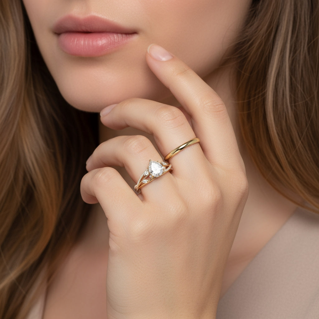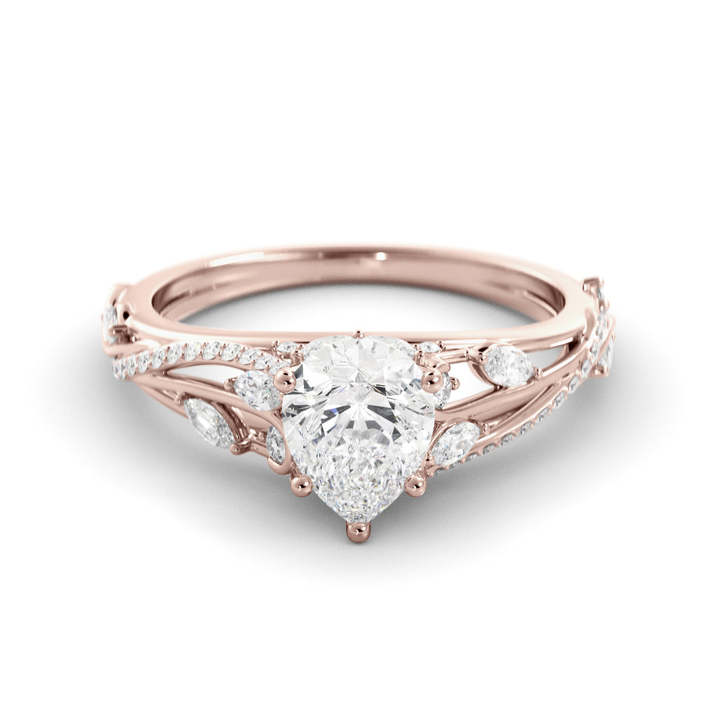 במרכז ניצב יהלום בצורה טיפה (Pear cut) בגודל 8.5x6.5 מ"מ (כ־1.28 קראט בקירוב), ולצידו שילוב יהלומים עגולים ומרקיזה המעטרים את הכתר ואת הזרועות בעדינות קסומה.