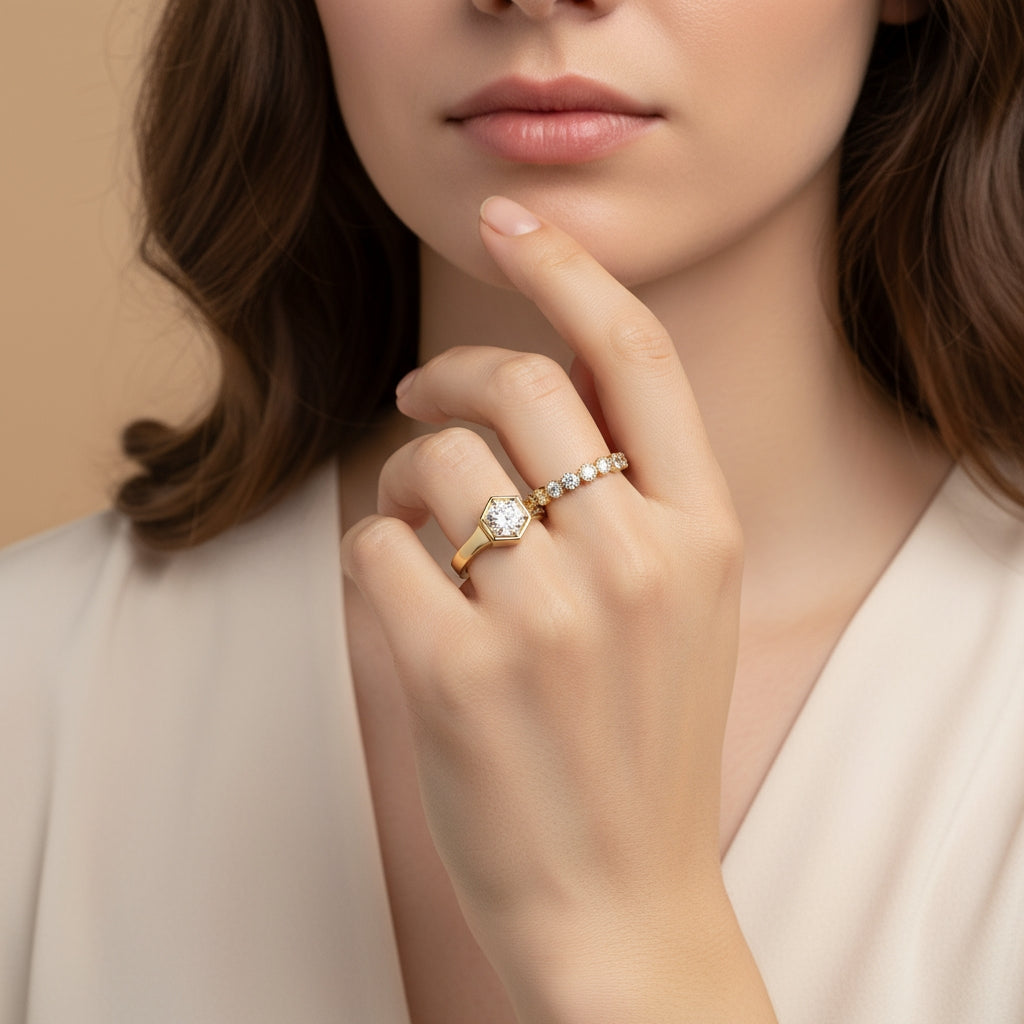 הצורה המשושה מעניקה לטבעת מראה גאומטרי עדכני וייחודי — תכשיט שהוא הצהרה של סגנון, מושלם לאישה חזקה ובטוחה בעצמה.