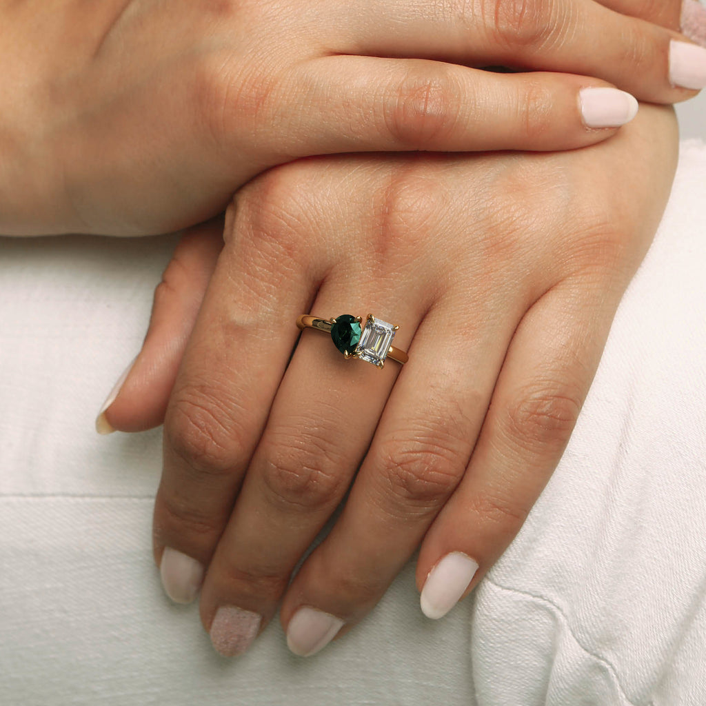 טבעת "טואה אה מואה" יפהפייה בעבודת יד, המסמלת "את ואני". אבן אמרלד ירוקה בצורת טיפה פוגשת אמרלד ירוקה מרהיבה בחיתוך אמרלד. יופי ייחודי של אהבה, שמחה וחיבור. מתנה מושלמת למי שמחפשת סמל צבעוני ויוצא דופן לאהבה!