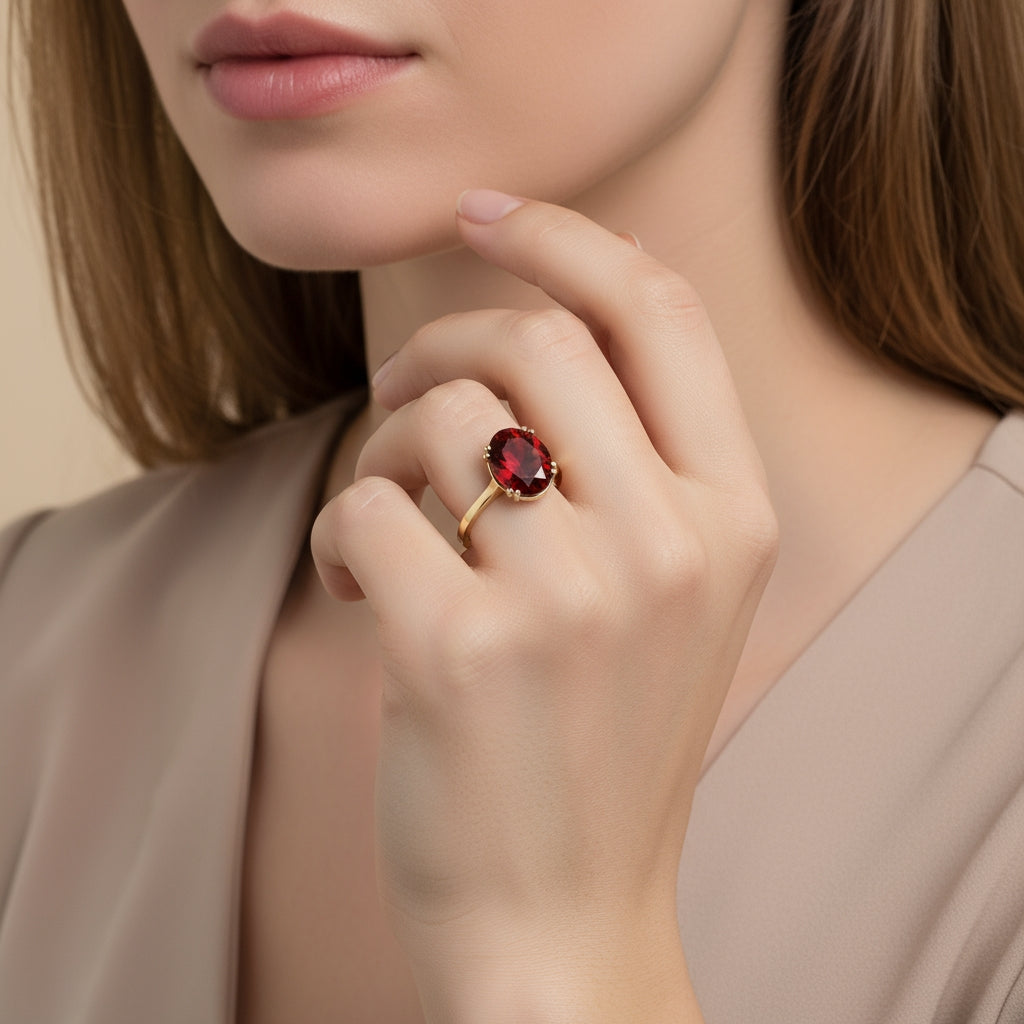טבעת זהב בעיצוב קלאסי ונקי, המשובצת באבן גרנט קורנדום בגודל 11x9 מ״מ, משקל 3.01 קראט (Grade AAA).