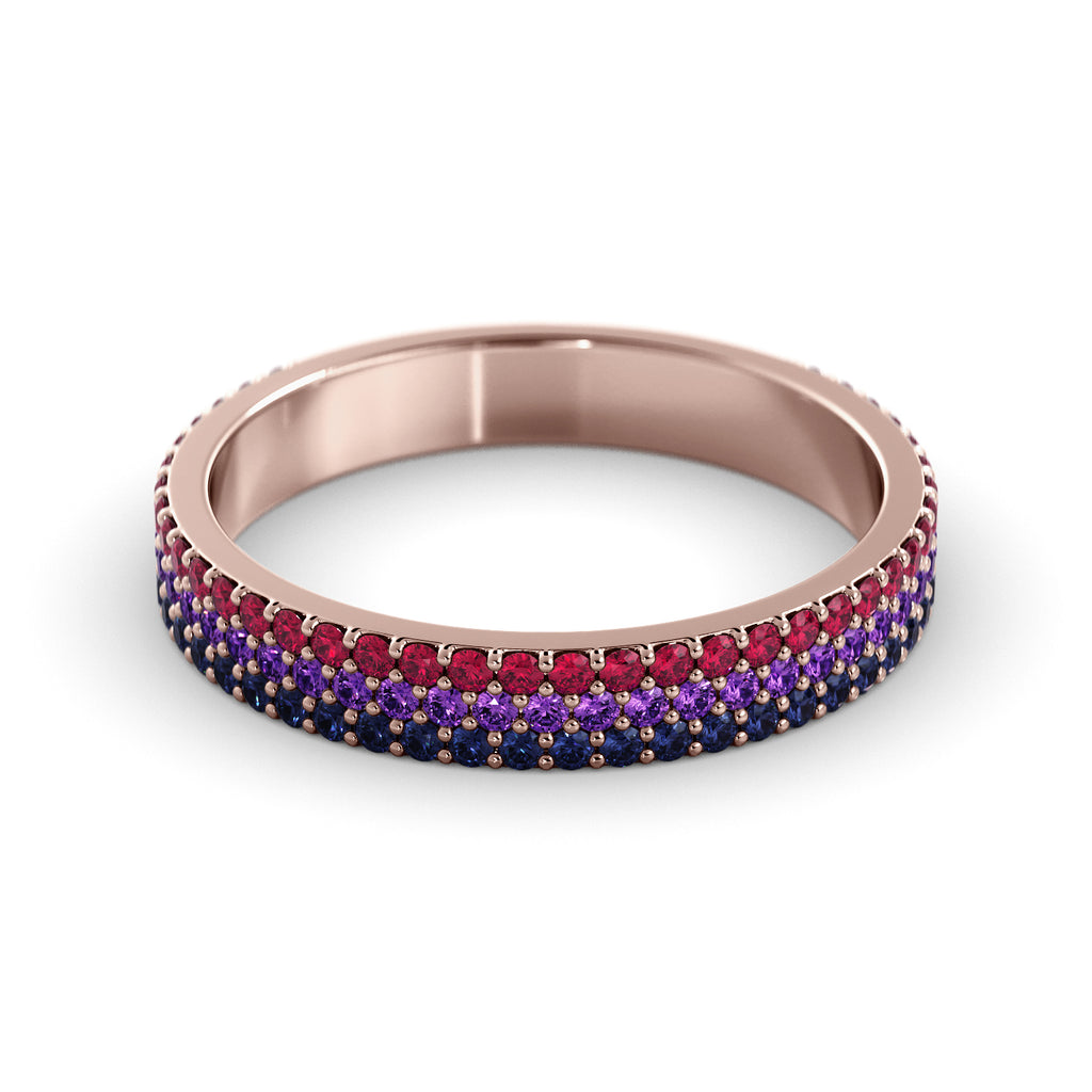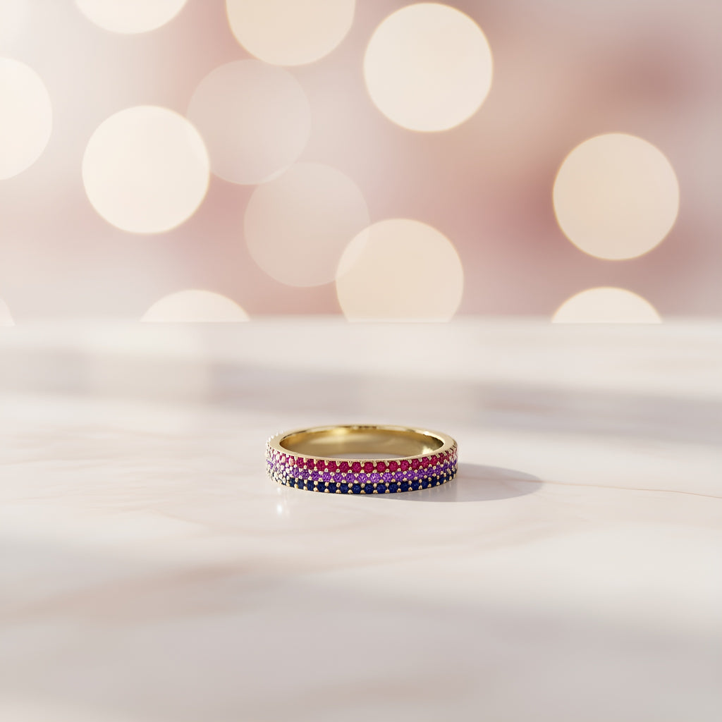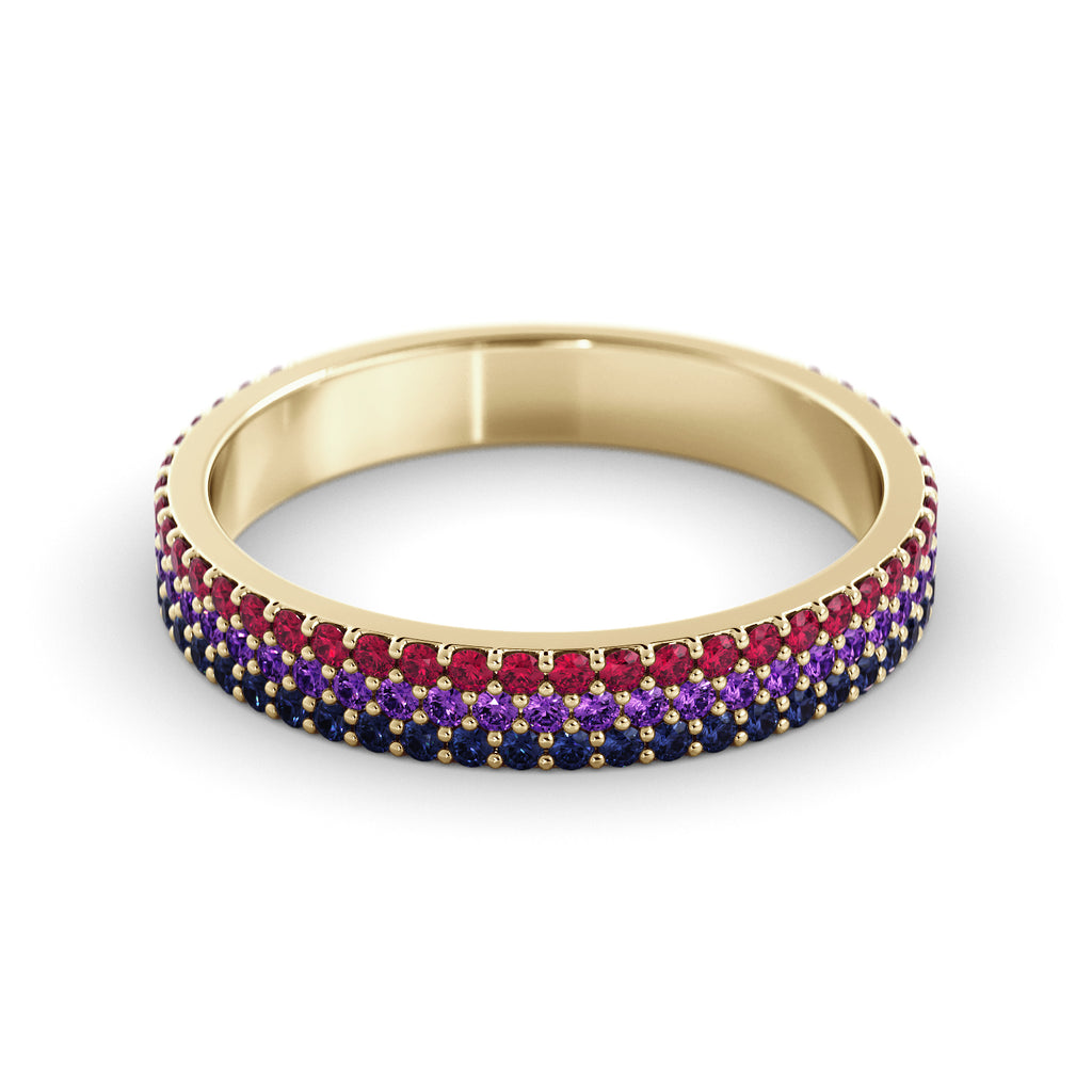 טבעת זהב ייחודית בעיצוב pavé תלת-שורי, המשובצת באבני רובי, ספיר ואמטיסט — שילוב צבעים שמספר סיפור של עוצמה, רוך וקסם.
