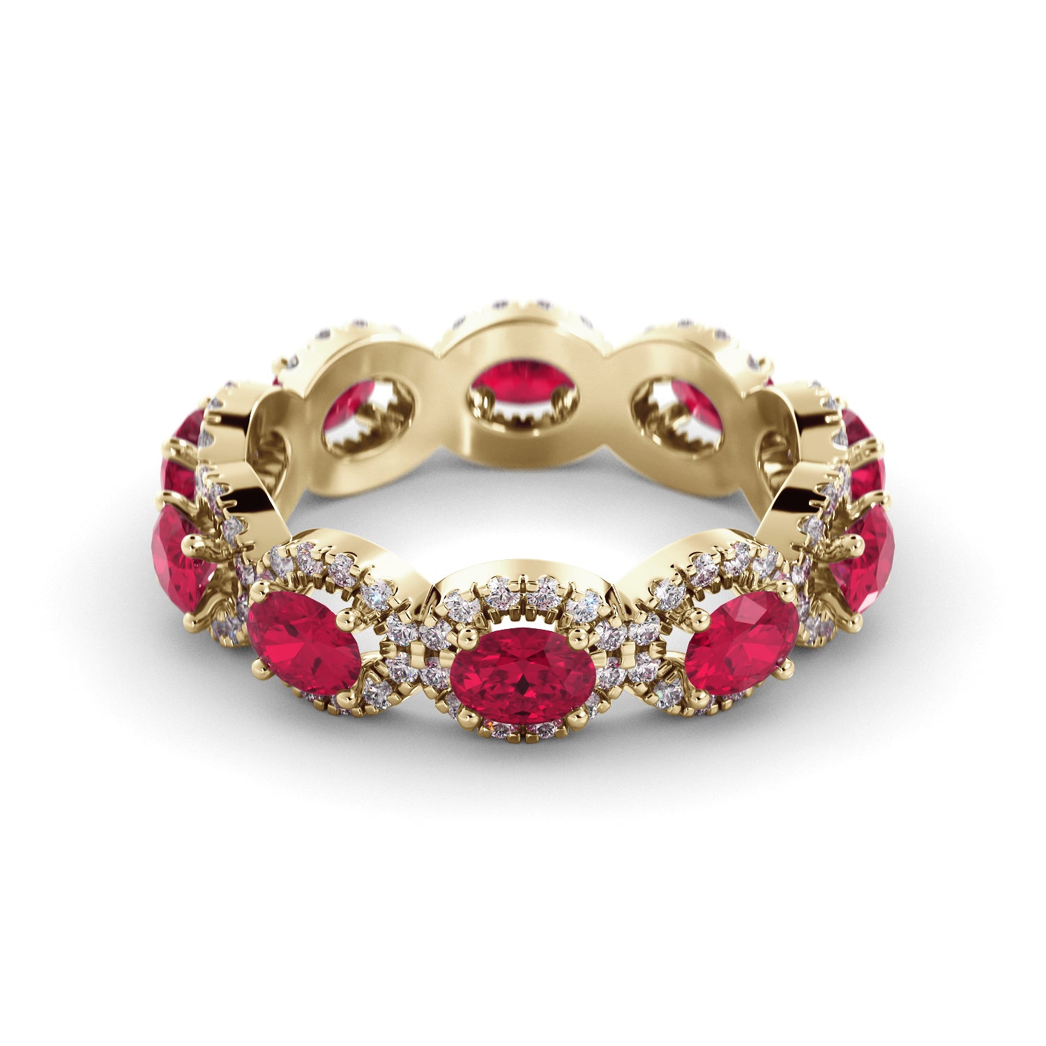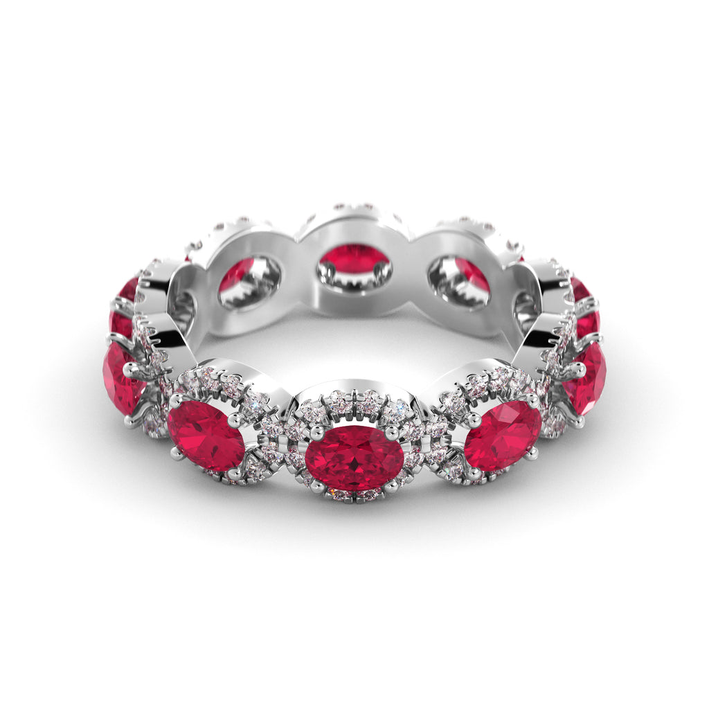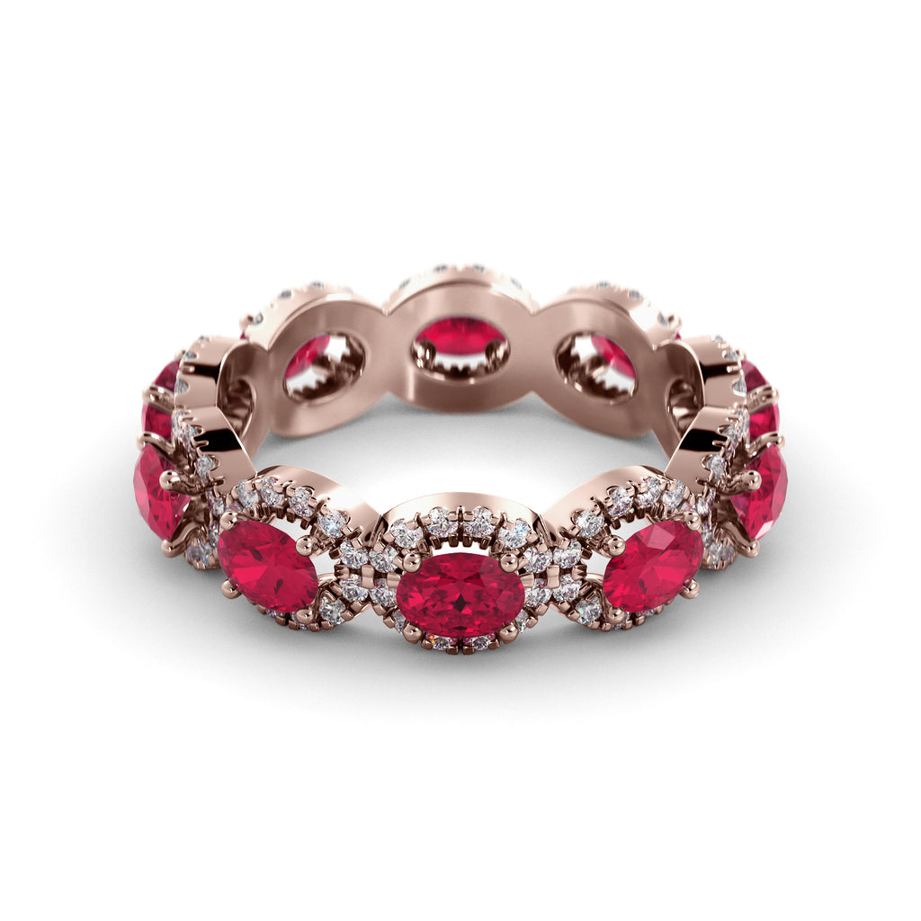 טבעת נצח מזהב נדירה ביופיה משובצת אבני-חן רובי קורנדום ורוד-אדום ויהלומים.