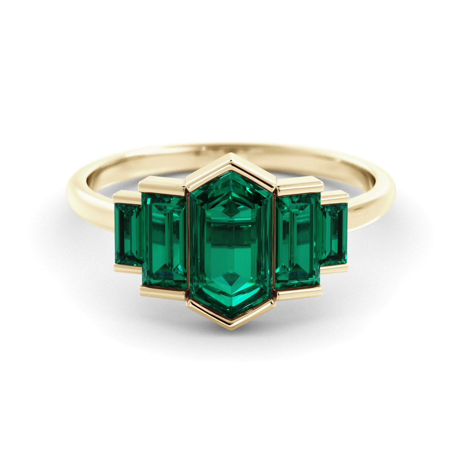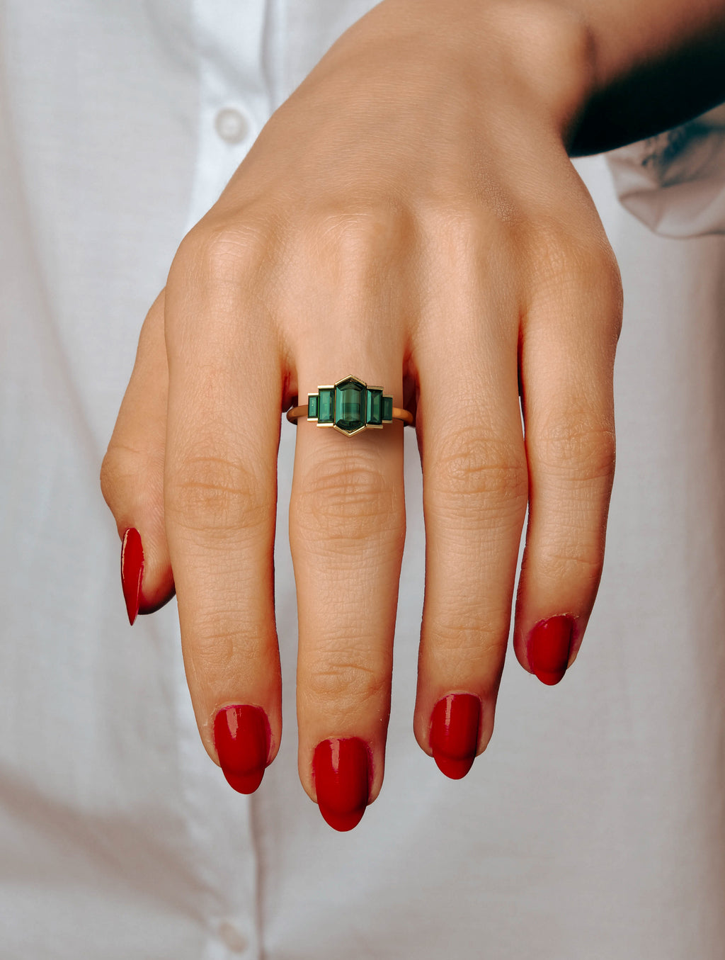 טבעת יוקרתית וזהובה המעוטרת בחמישה אבני אמרלד נוצצות בחיתוך מלבני והקסגוני. האבן המרכזית במרכז נוצצת בעוצמה ירוקה עזה, ומסביבה ארבע אבנים קטנות יותר היוצרות סימטריה הרמונית ומודרנית. שילוב הזהב החמים עם הירוק המלכותי מעניק לטבעת מראה עוצמתי, נשי ואלגנטי – תכשיט שמדגיש נוכחות ומספר סיפור של כוח ויופי נצחי.
