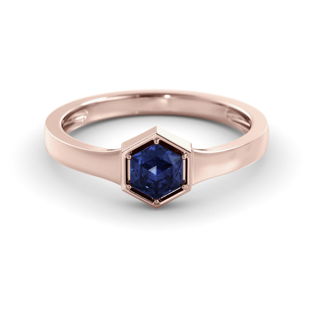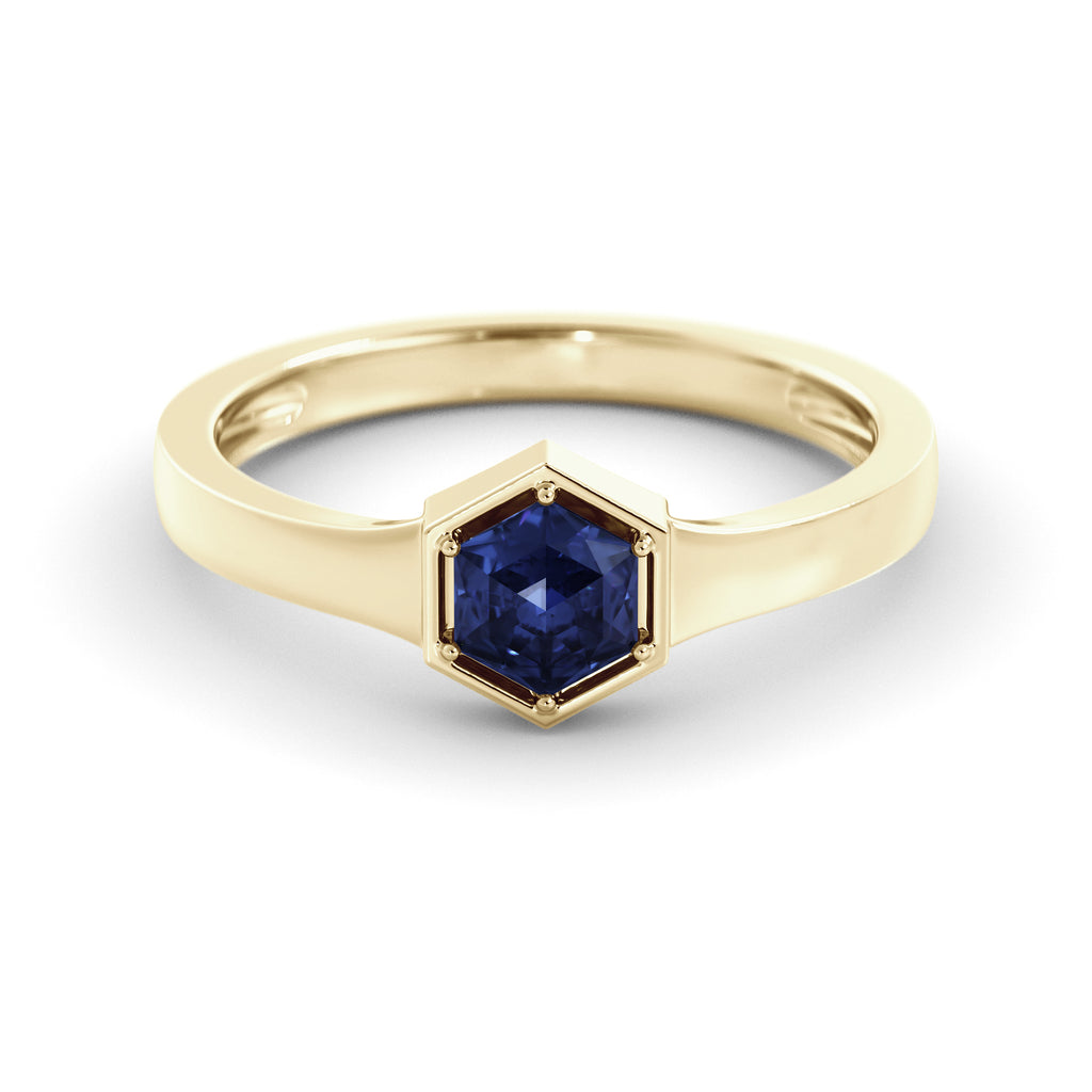 טבעת זהב אלגנטית ומודרנית בעבודת יד, המשובצת באבן ספיר כחולה מסוג קורונדום (0.55 קראט, דרגת איכות AAA) בחיתוך משושה ייחודי (Hexagon cut).