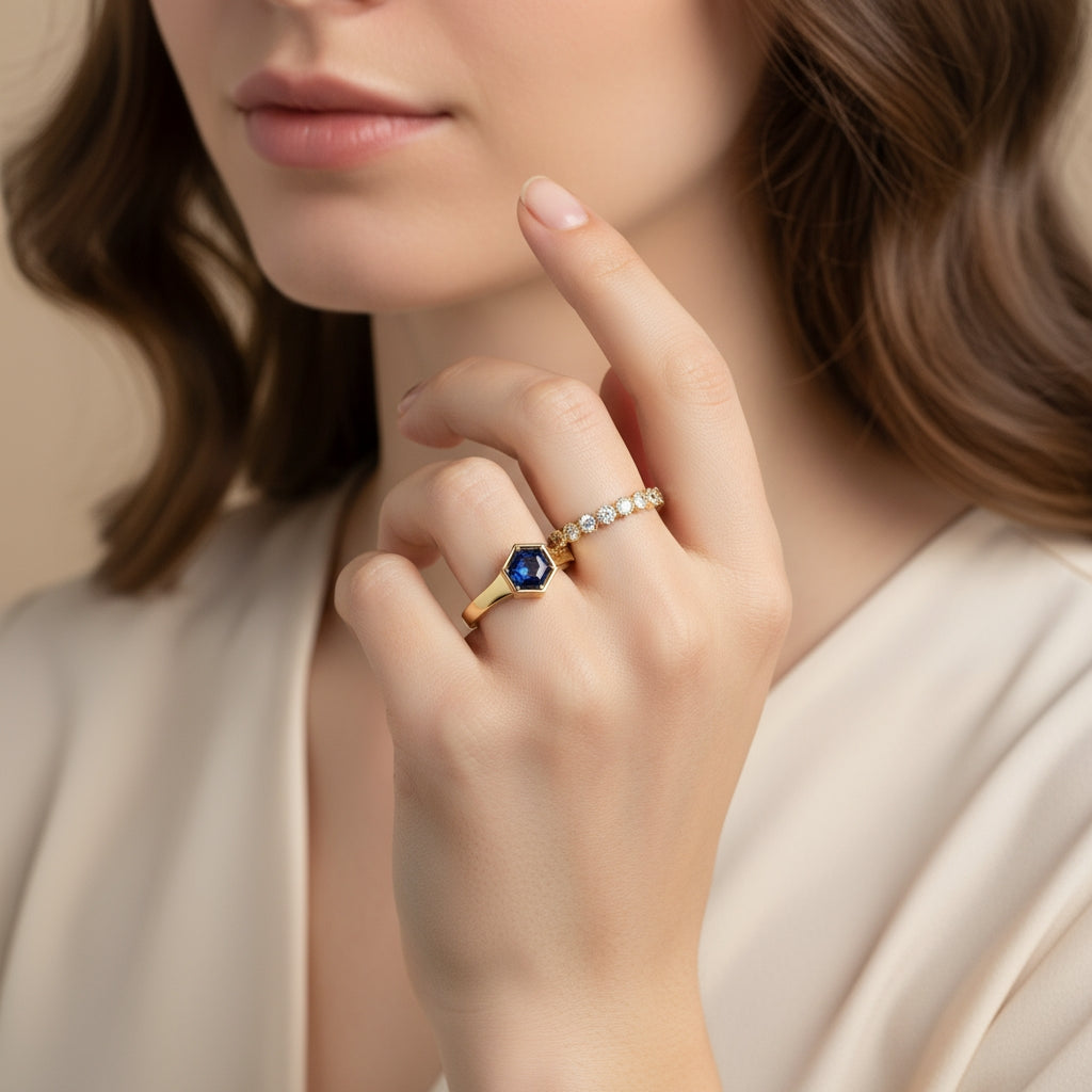 העיצוב הגאומטרי מעניק לטבעת מראה עכשווי ונקי, בעוד גוון הכחול העמוק של הספיר מוסיף תחושת עומק ויוקרה נצחית.