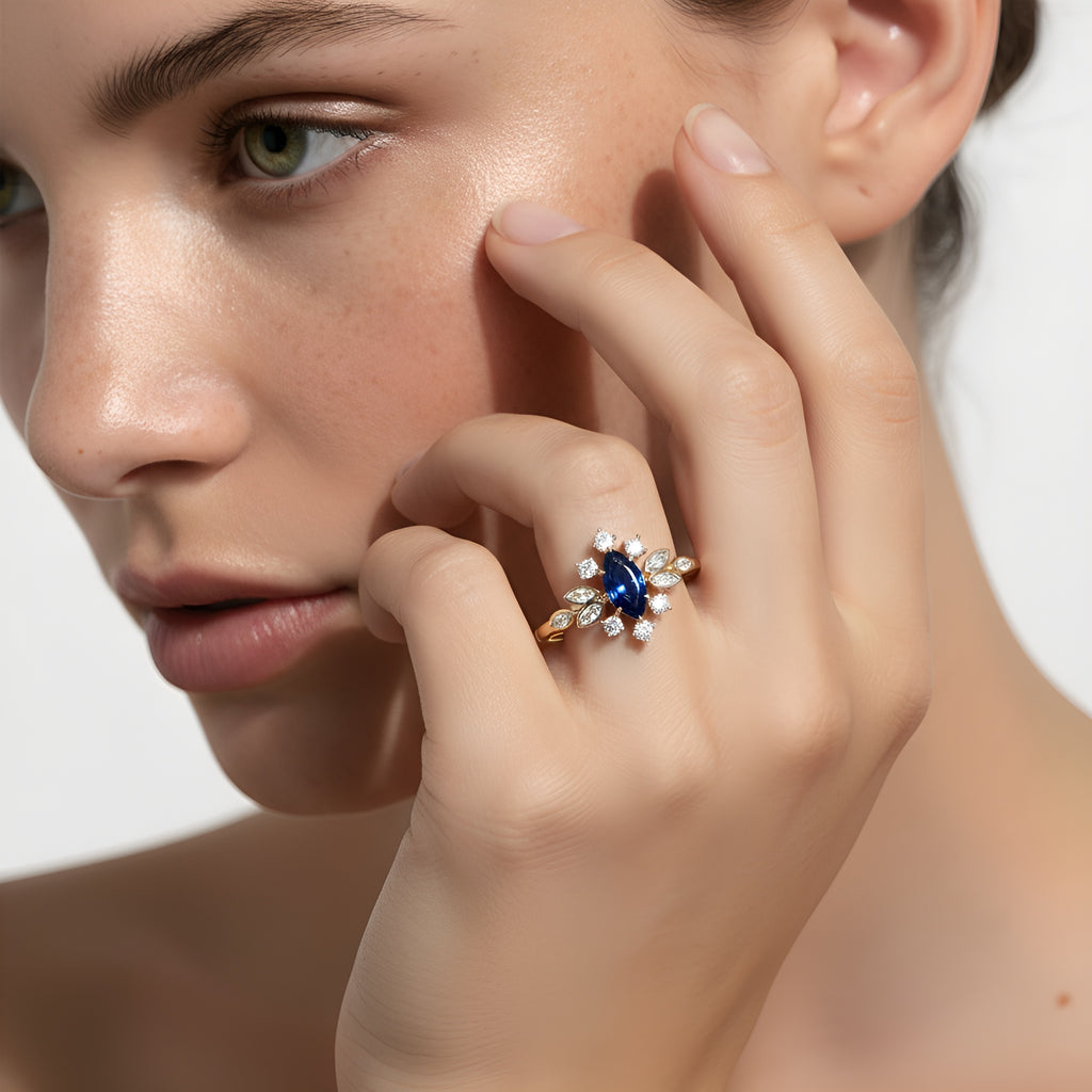 טבעת נדירה ביופיה משובצת אבן-חן ספיר קורונדום כחולה ויהלומים טבעיים