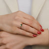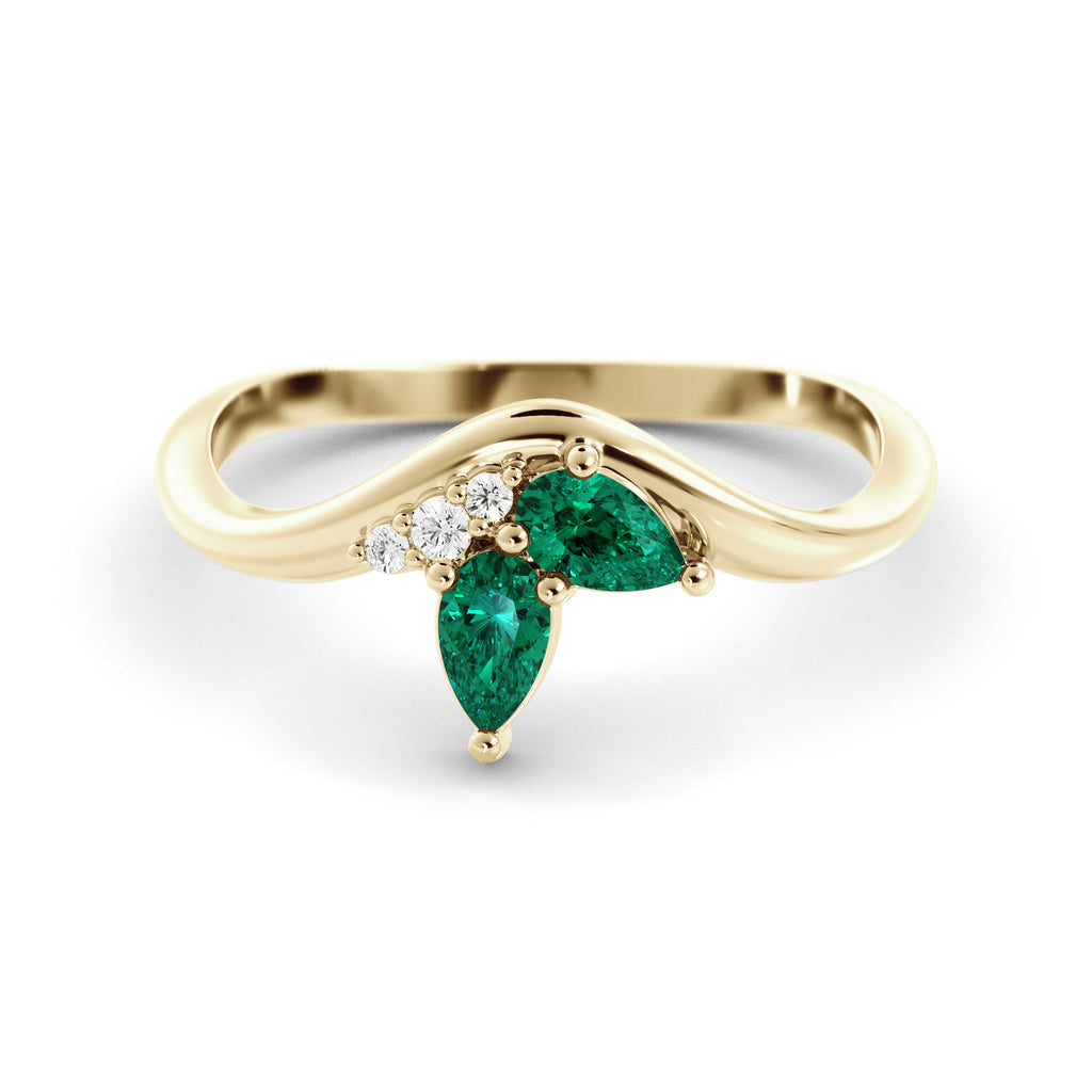 טבעת זהב ייחודית עם עיקול עדין ועיצוב מודרני. שתי אבני אמרלד ירוקות בחיתוך טיפה זוהרות במרכז ומוקפות בשלושה יהלומים קטנים, המוסיפים ברק עדין ונוצץ. השילוב בין הירוק המלכותי של האבנים לבין הזהב החמים יוצר טבעת נשית, קלאסית ונצחית – תכשיט שמקרין יוקרה ואצילות טבעית.