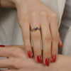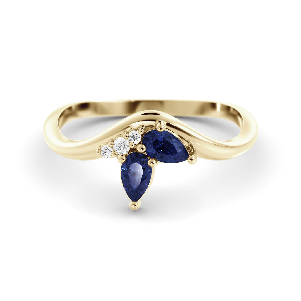 טבעת זהב ייחודית בעלת עיקול עדין ועיצוב מודרני. שתי אבני ספיר כחולות נוצצות בצורת טיפה משתלבות בהרמוניה מושלמת עם שלושה יהלומים קטנים המוסיפים נגיעה של אור ונצנוץ. השילוב בין הכחול העמוק של הספירים לבין הזהב החמים יוצר טבעת קלאסית, נשית ומרשימה – תכשיט על-זמני שמתאים לכל רגע מיוחד.