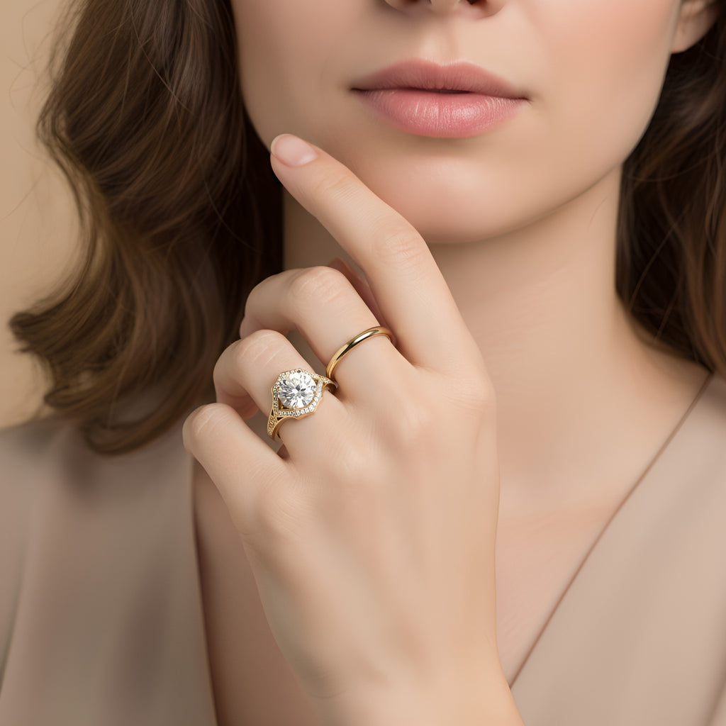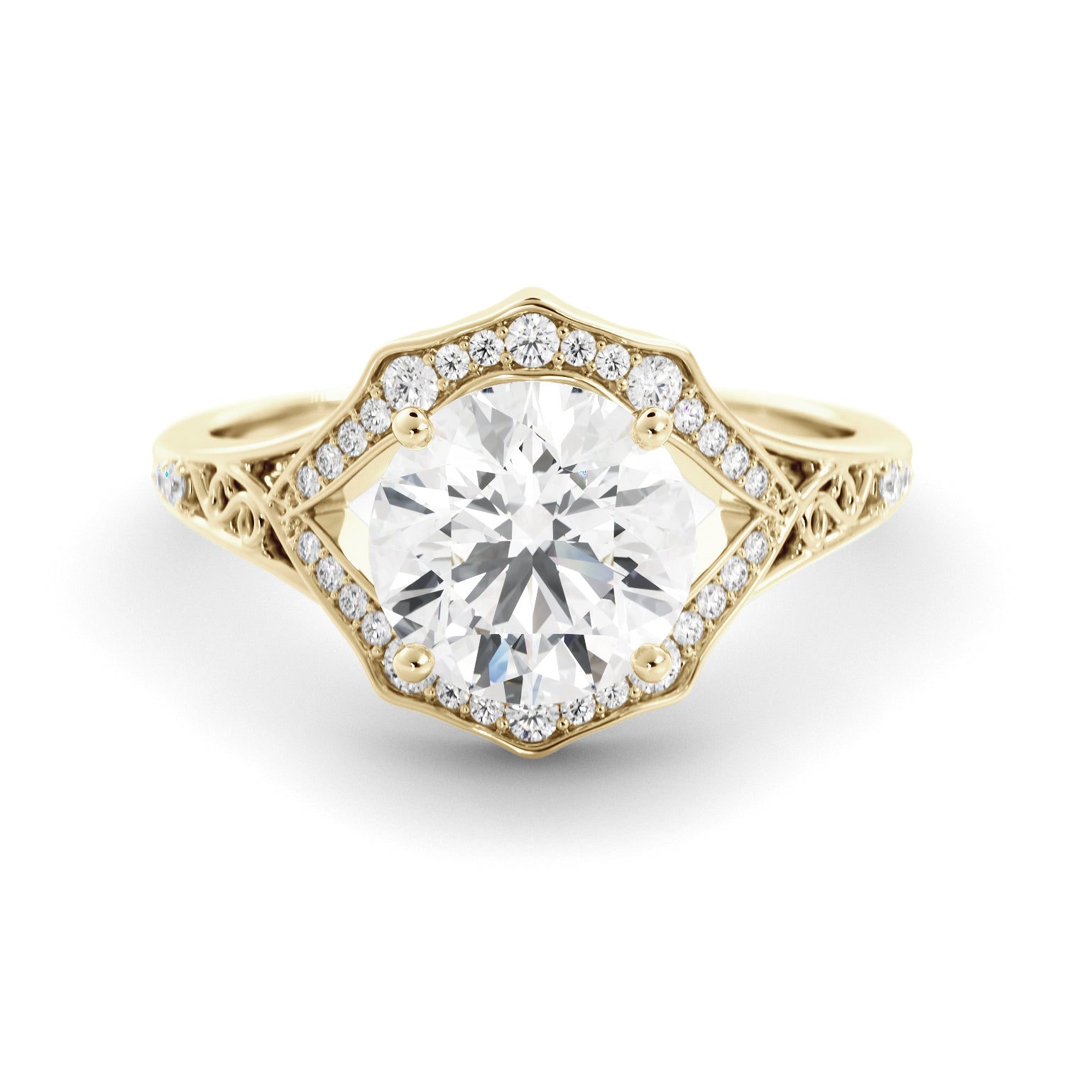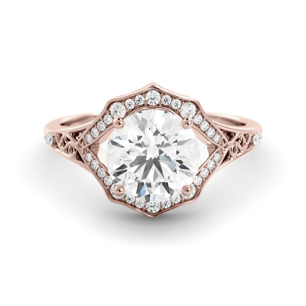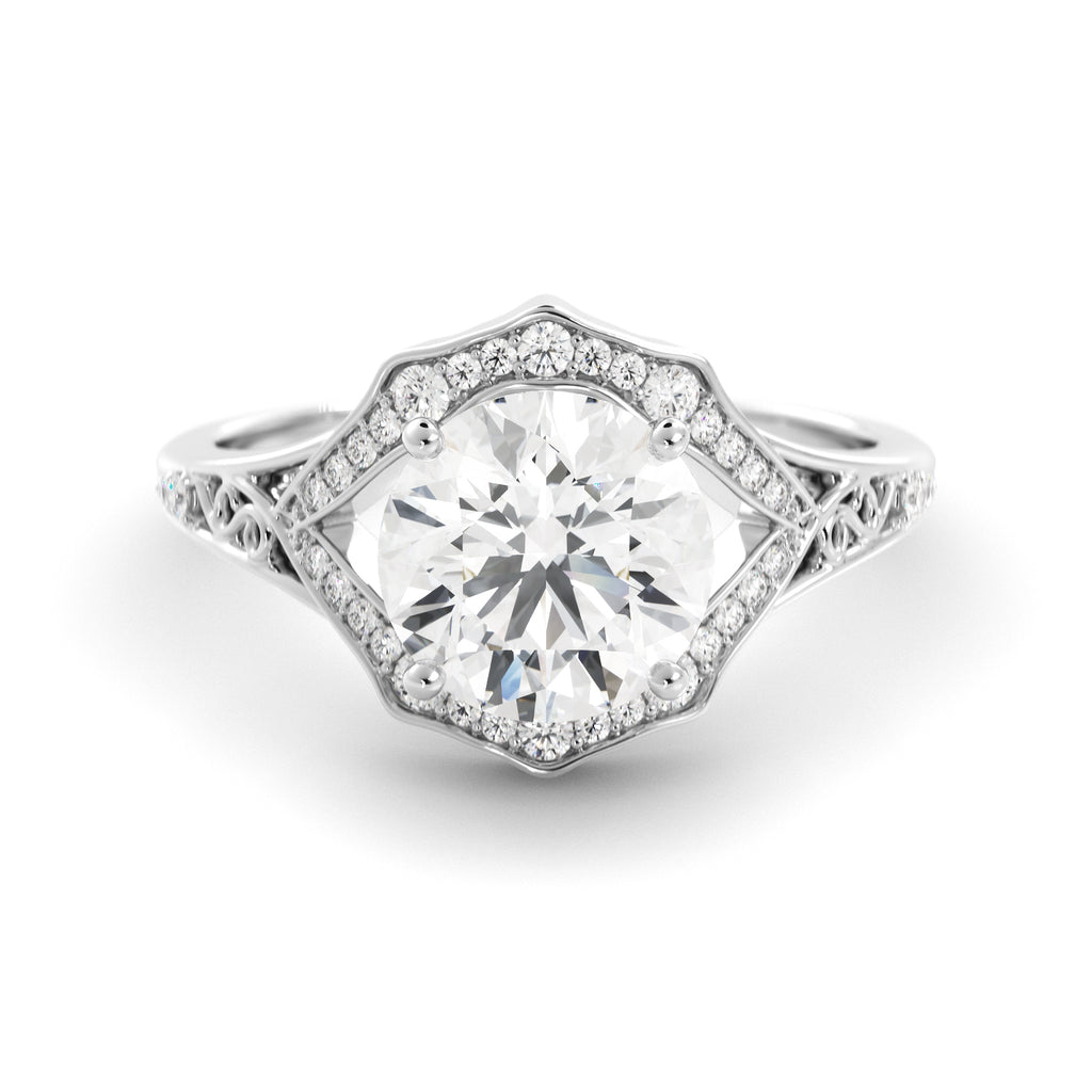 טבעת אירוסין בעיצוב וינטג’ אלגנטי, משובצת ביהלום ממעבדה (CVD Lab Grown Diamond) מרכזי מרשים, מוקף הילה של יהלומים עגולים נוצצים.